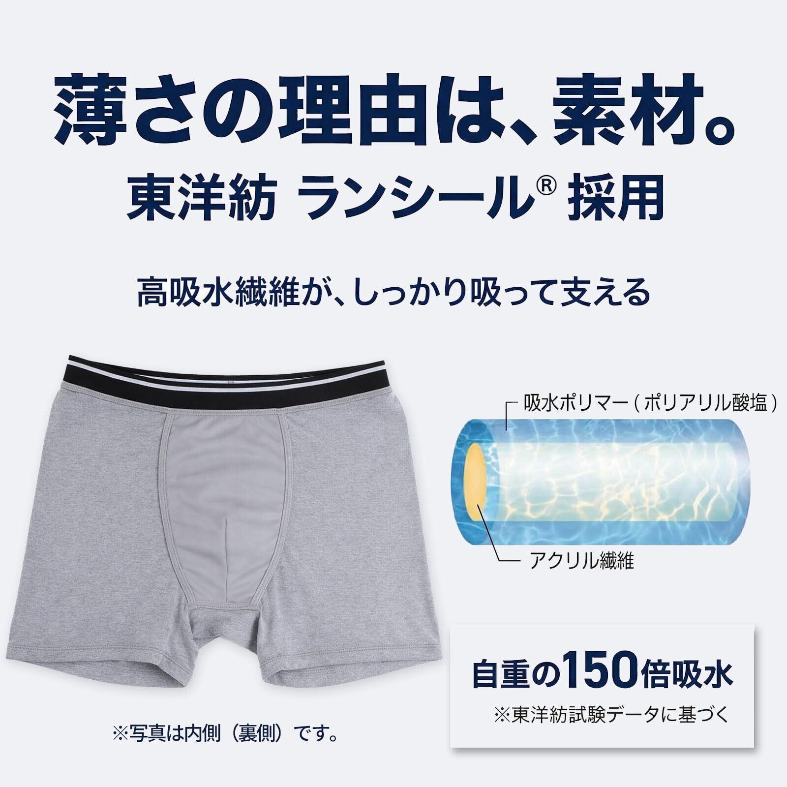 【高機能吸水パッド「ランシール」採用】 日本製の高機能素材を使用し、約20ccの尿漏れを吸収。吸水・消臭・抗菌性能でニオイや菌の繁殖を抑え、快適さが続きます。