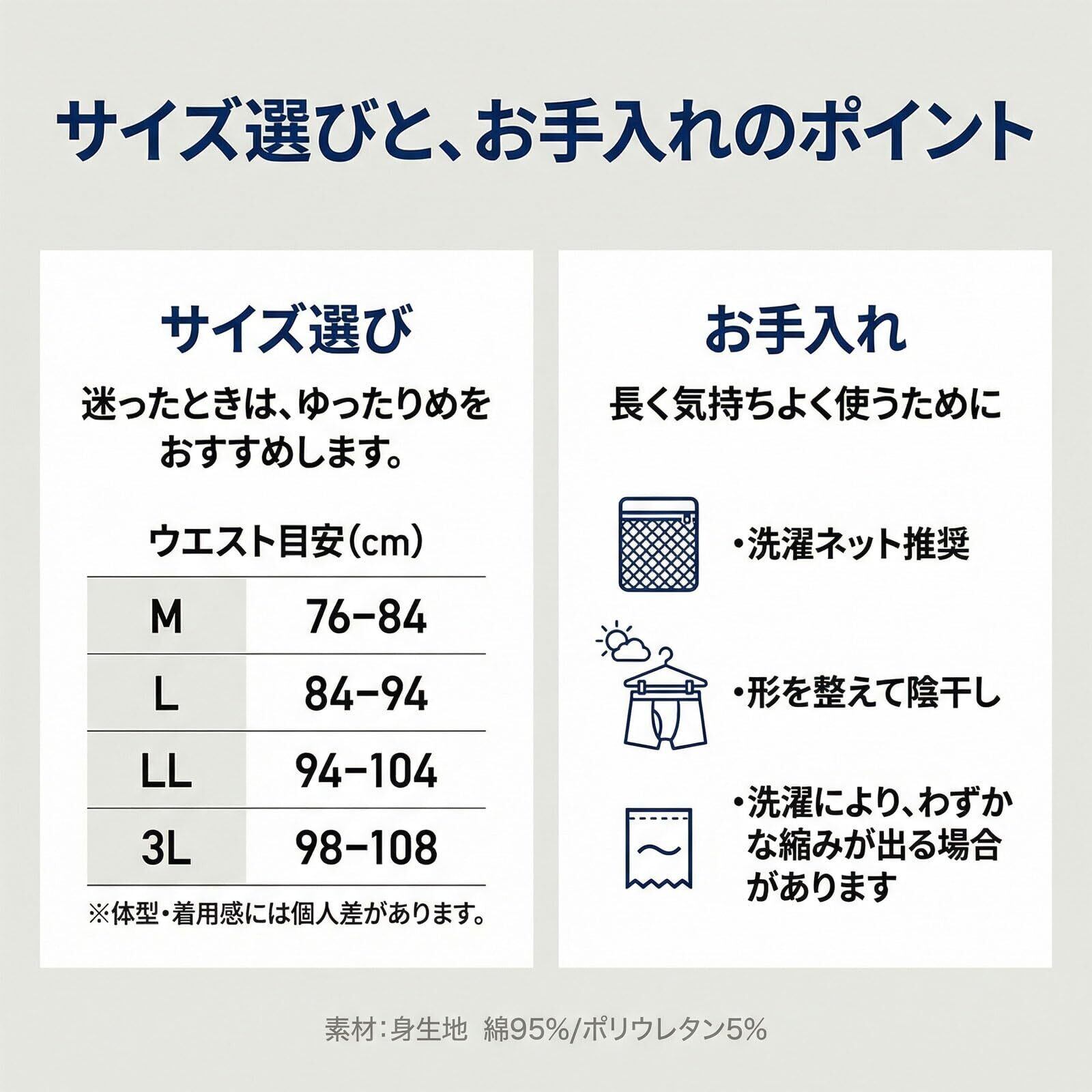 【素材・サイズ展開】 綿95%、ポリウレタン5%。サイズはM(76~84cm)、L(84~94cm)、LL(94~104cm)、3L(98~108cm)です。