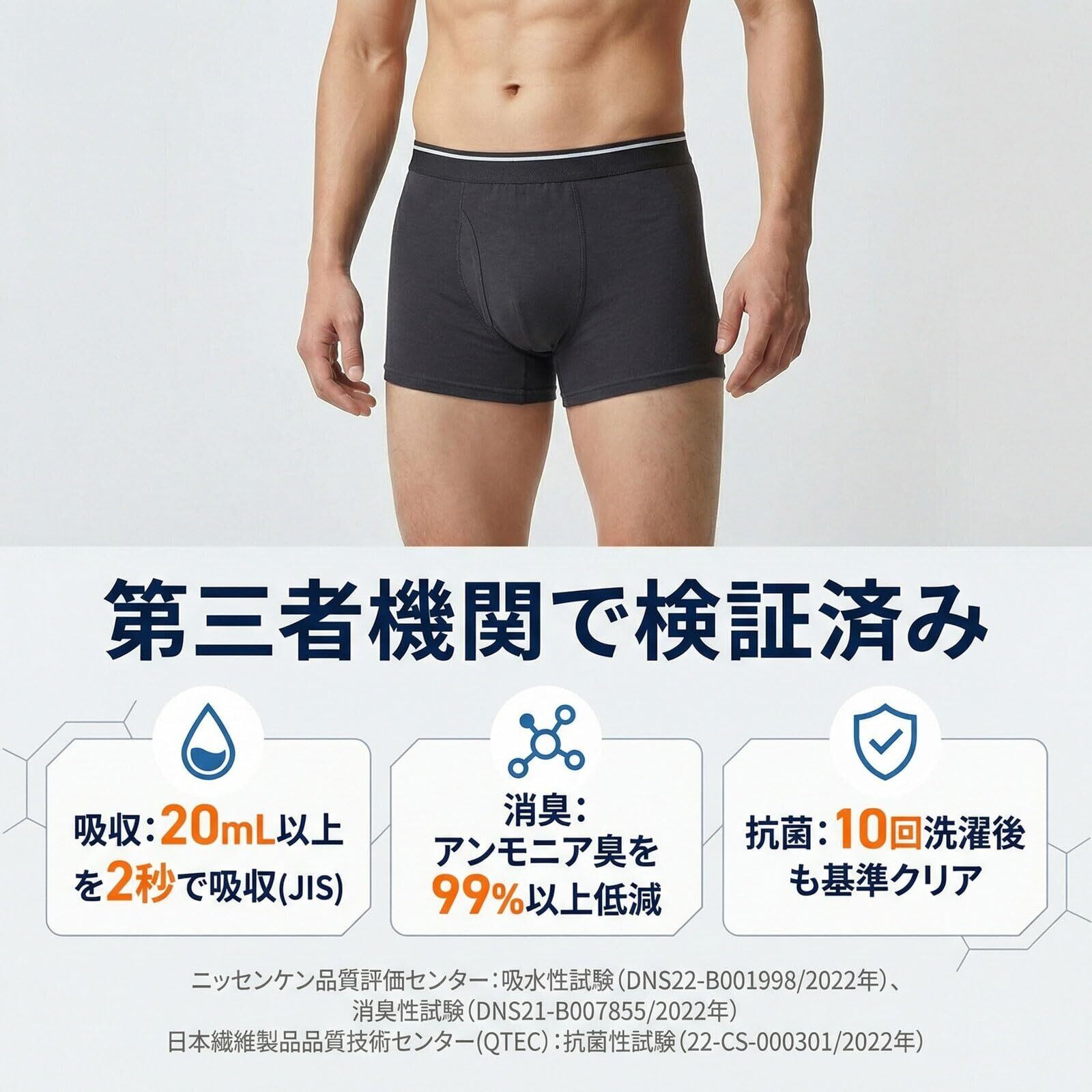【信頼の品質と耐久性】 JIS規格に基づく試験で吸水・消臭・抗菌性能を実証。洗濯後も性能を維持し、繰り返し使用可能です。