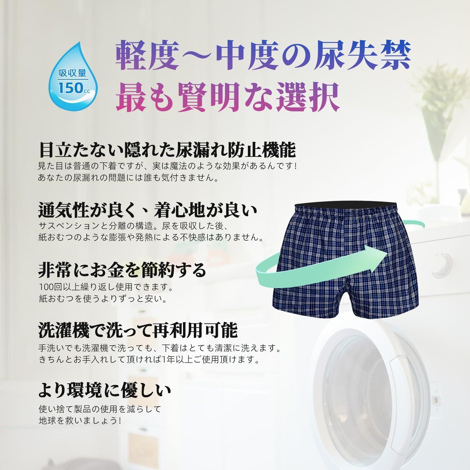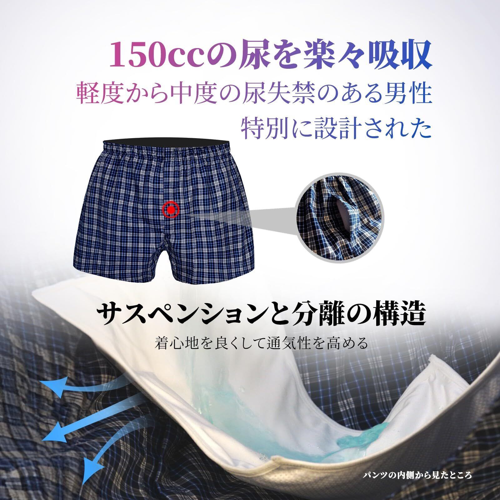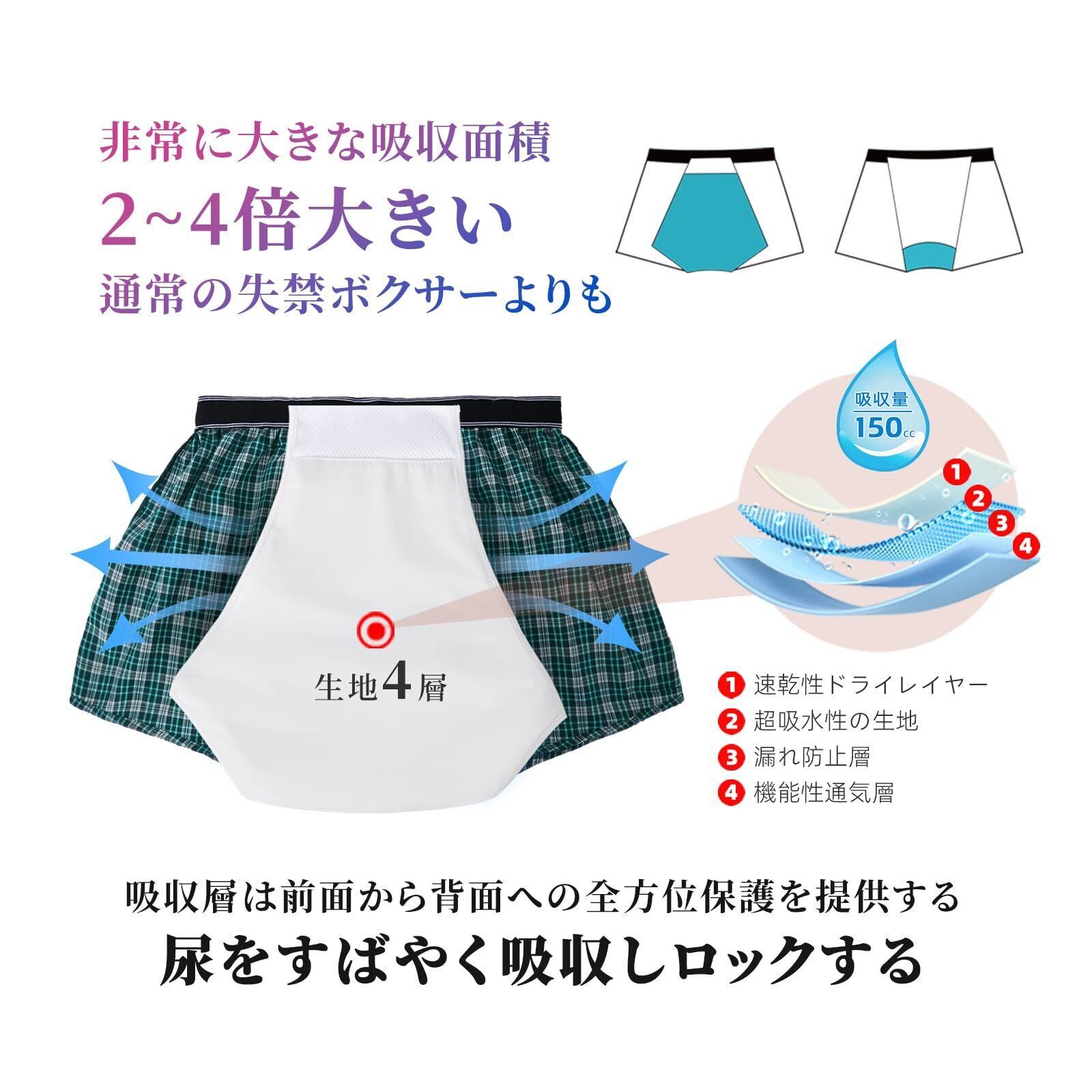 【150cc吸水量】男性用の失禁トランクスは、最大で150mlの液体を吸収できます。軽度から中程度の尿失禁の場合におすすめです。ただし、重度、深刻な、または全く失禁している場合には使用しないでください。