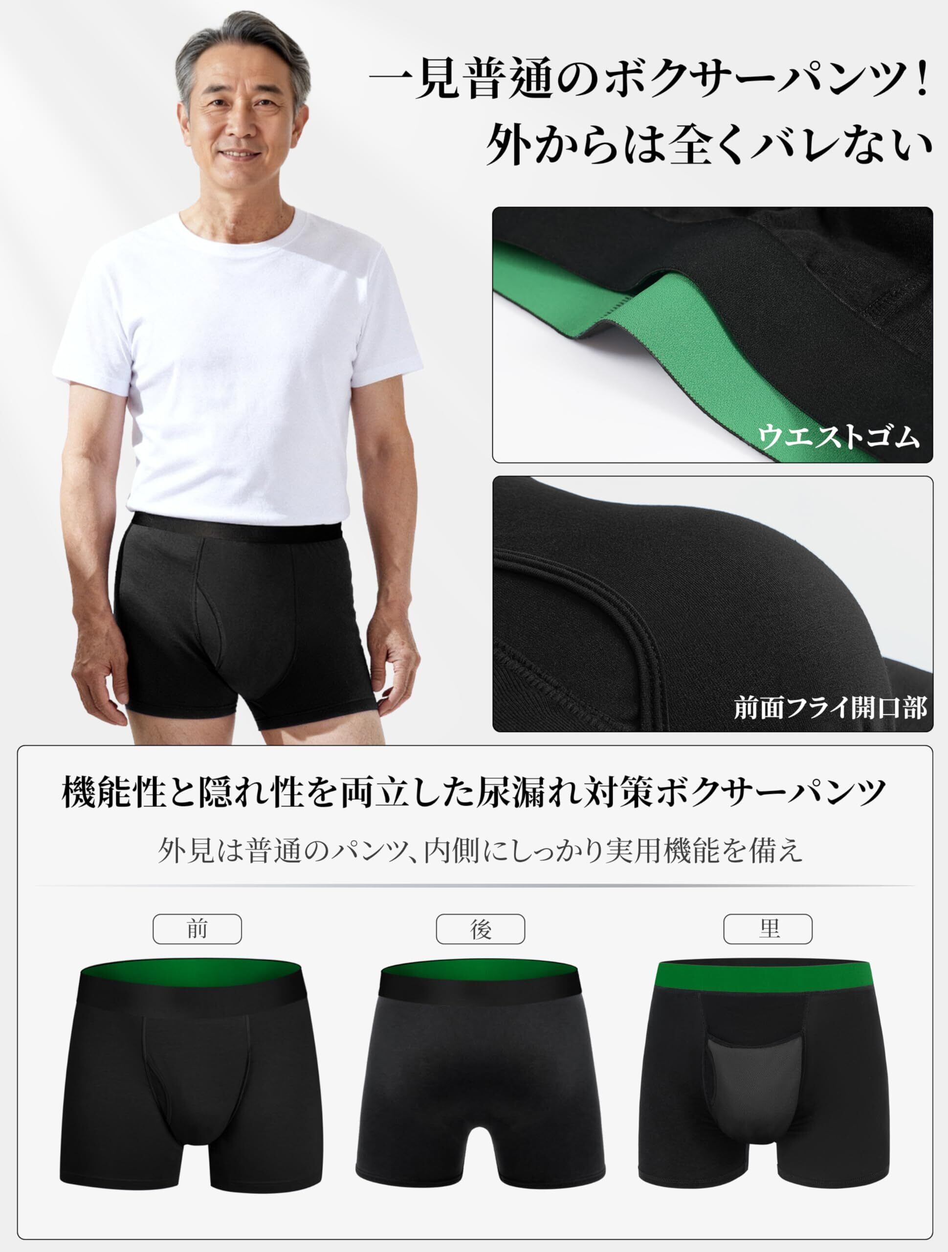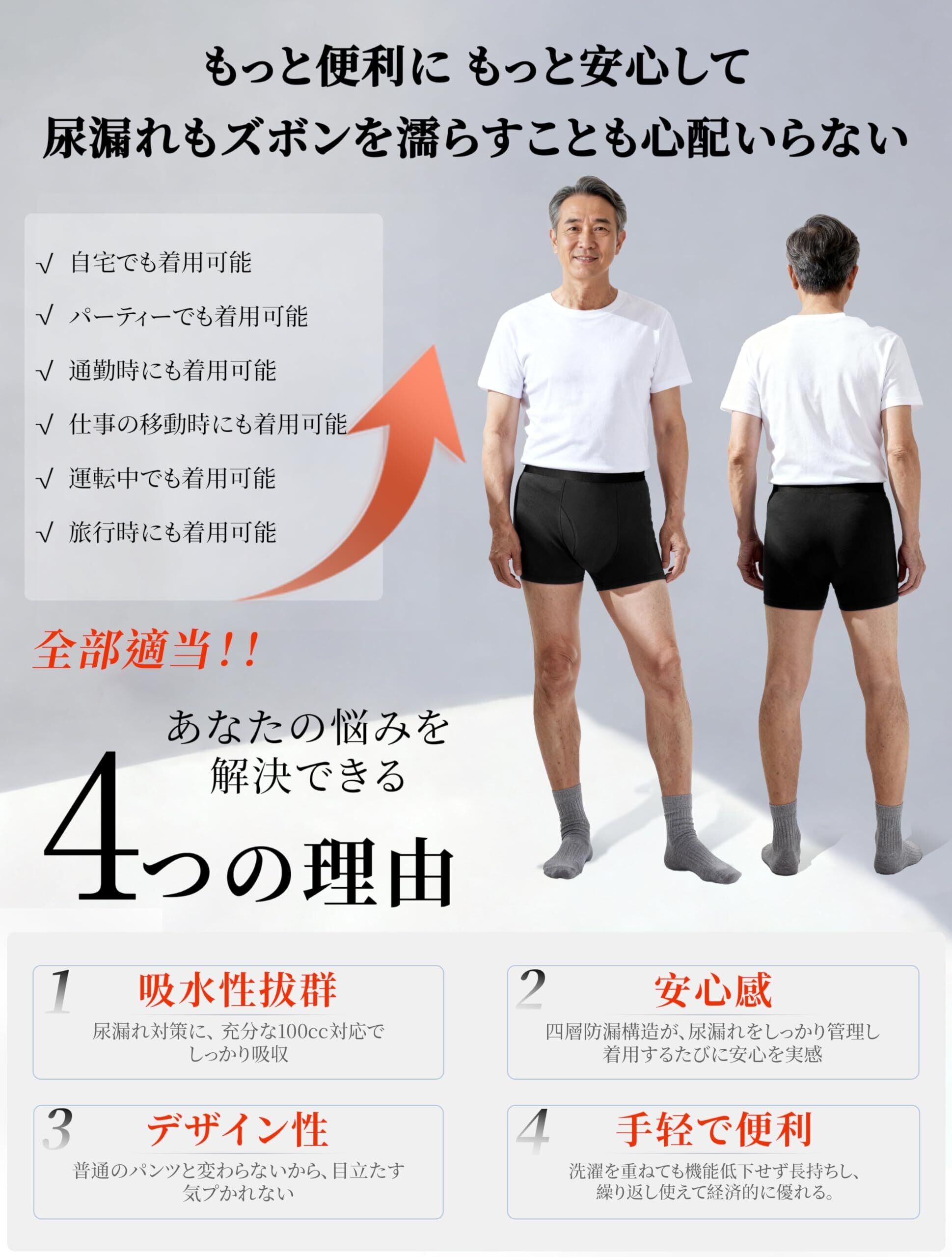 【自信を与えるデザイン】にょう漏れ 男性用 パンツは、外側から見ると通常のボクサーブリーフのように見え、前開き。デザインと機能を組み合わせ、トイレ使用中の不安を取り除きます。控えめなデザイン、完全な保護、そして快適さが、日常生活で自信を取り戻すのに役立ちます。