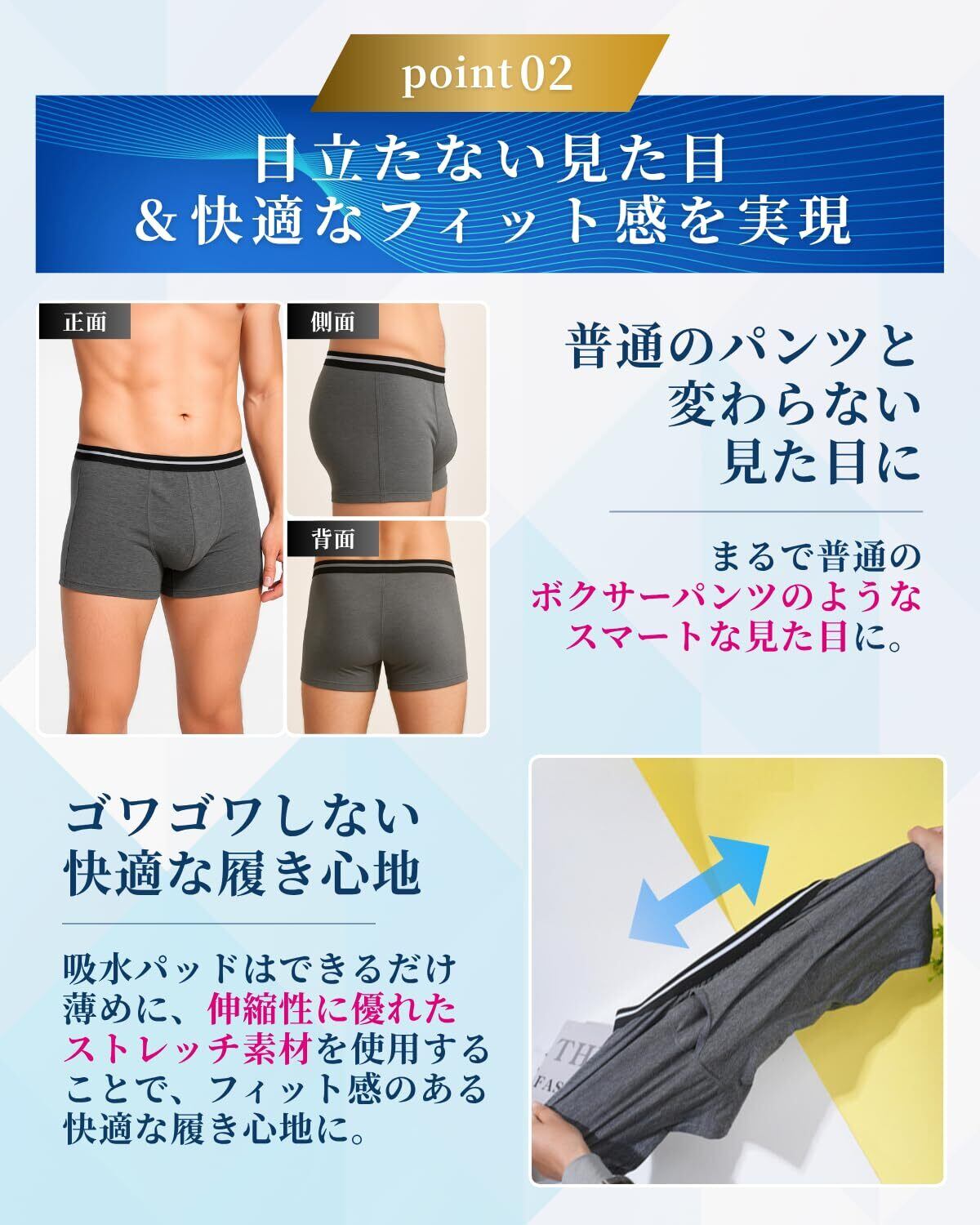 【毎日を快適に過ごすための失禁対策パンツ】日常生活での軽度な尿もれに悩む男性に最適な失禁パンツ 男性用。通勤や外出、就寝時などさまざまなシーンで安心を提供。見た目は一般的な男性用下着と変わらず、自然に着用できるため、気兼ねなく毎日使えます。