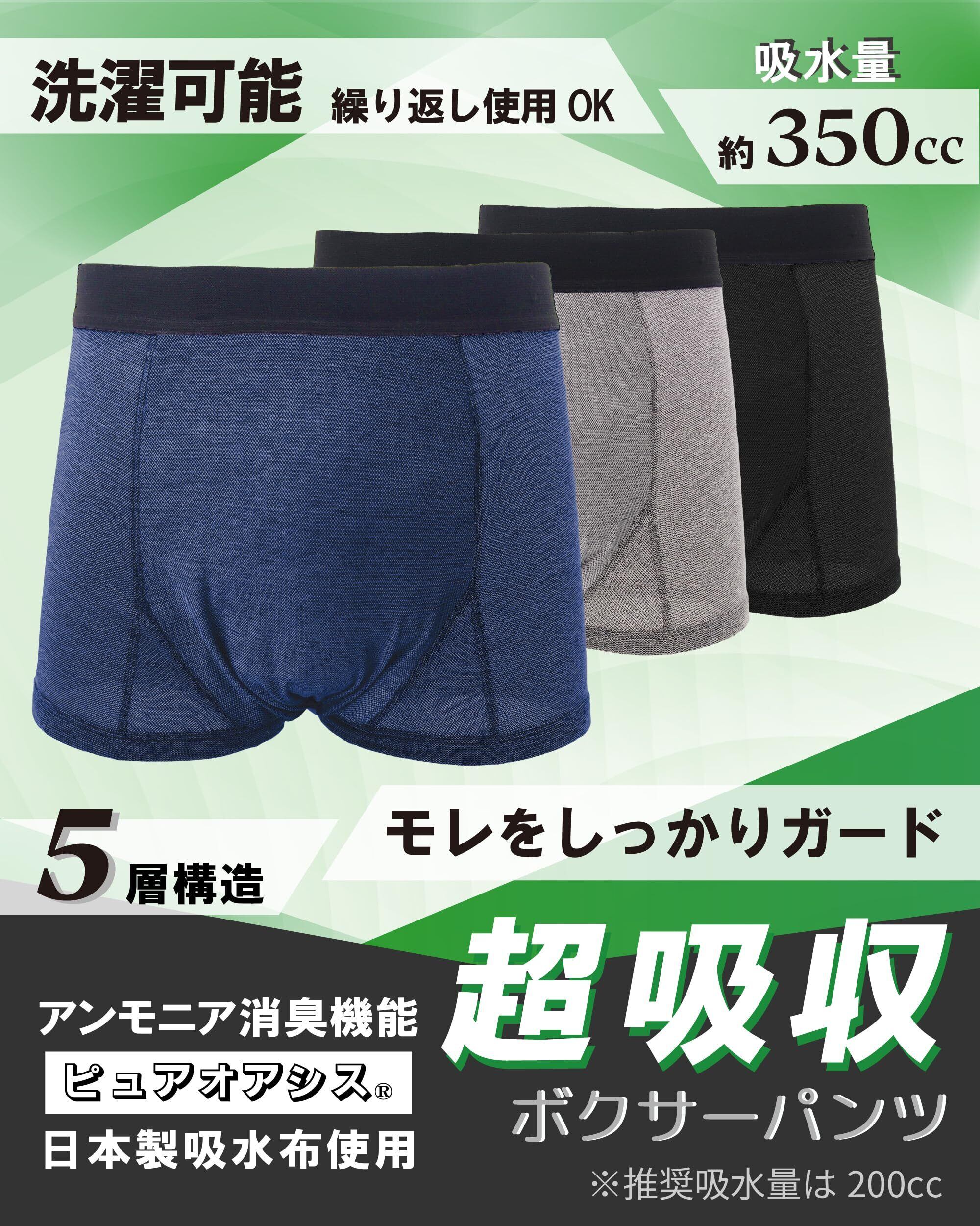失禁パンツ アンモニア 消臭 男性用 メンズ 多量 超吸収 尿漏れケア 大容量 メッシュ ボクサーパンツ ピュアオアシス 日本製吸水布 パッド 臭い対策 (ネイビー+グレー+ブラック, M, 3, 枚) | 毎日発送✿はなまる