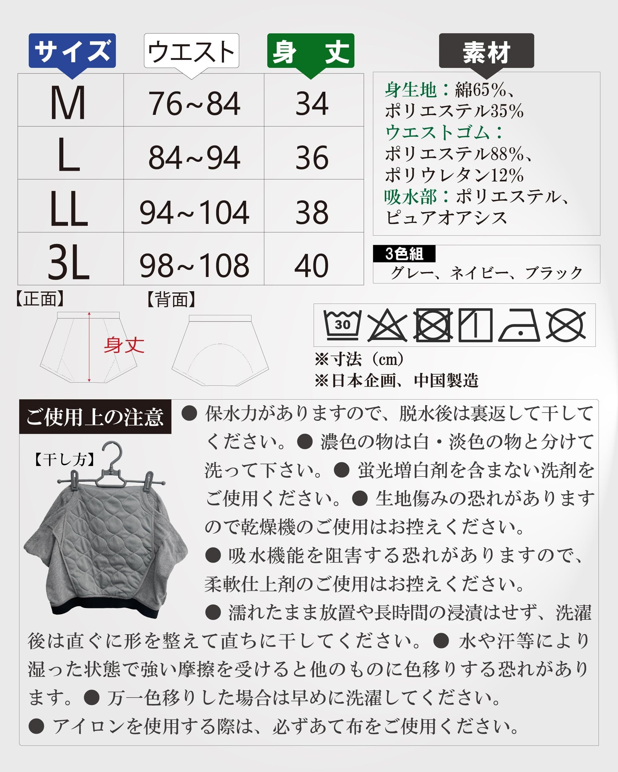 ・素材: 身生地:綿65%・ポリエステル35%、ウエストゴム:ポリエステル88%・ポリウレタン12%、吸水部:ポリエステル・ビュアオアシス