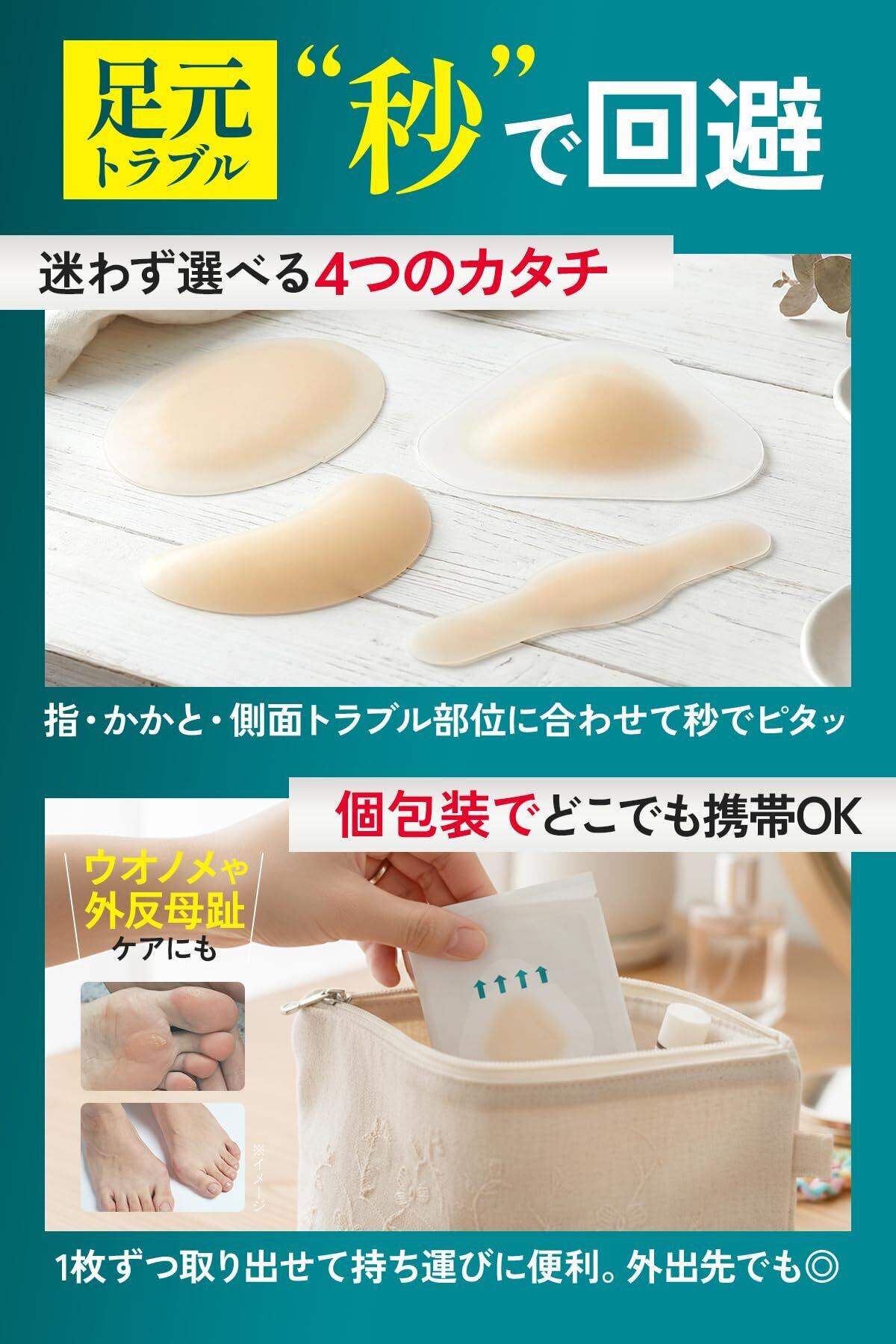 【4種形状・全部位対応】 だ円・三角・月型・細型の4バリエーション展開で、あらゆる足の形状にフィット。靴擦れ防止はもちろん、自分に合う形が見つかりにくかった「指の間」や「かかと」まで幅広くカバー。部位ごとに最適な形状を選べるため隙間なく密着し、従来のポイント保護では届かなかった箇所の違和感も、貼った瞬間から物理的にガードします。