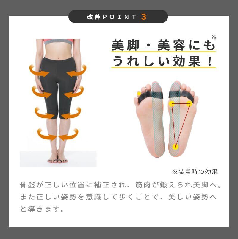 ️美脚へ!骨盤を正しい位置にサポート。体の重心が正常になり、開いた股関節が正しい位置に補正されます。足裏の重心が外側から内側に補正されることで、日本人の8割がなっているというO脚やX脚の改善をサポートします。