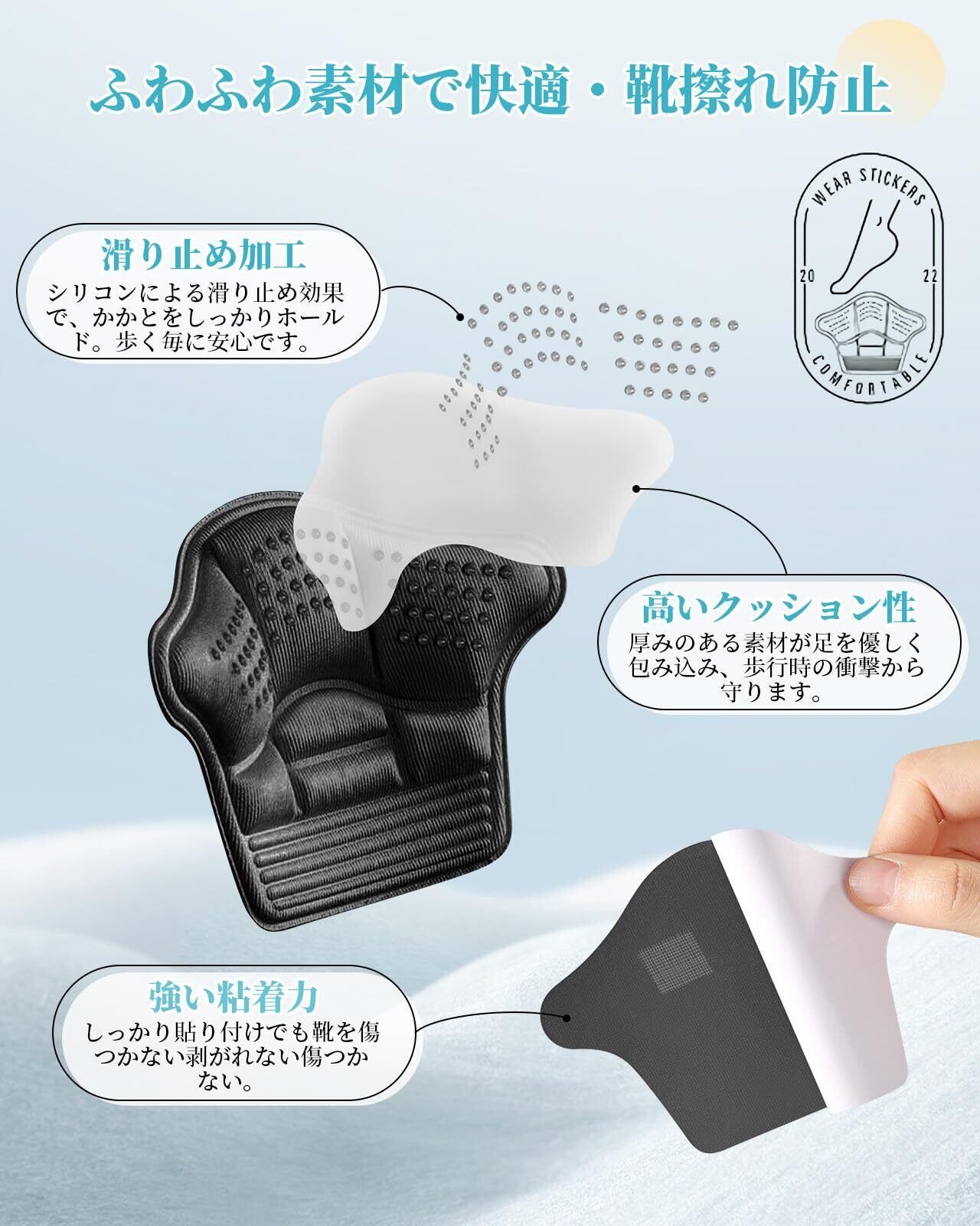 【高反発クッションで衝撃を軽減】特殊な高弾性素材を使用したかかとパッド。柔らかくも弾力のあるクッションが、歩くたびの衝撃から足裏を守り、かかとへの圧力と疲労を大幅カット。長時間歩いても楽々です。加えて、滑り止め効果でかかとをぴったり固定するので、パカつきやズレの心配がありません。通勤から旅行まで、靴擦れのストレスフリーな一日を実現し、足のダメージを軽減します