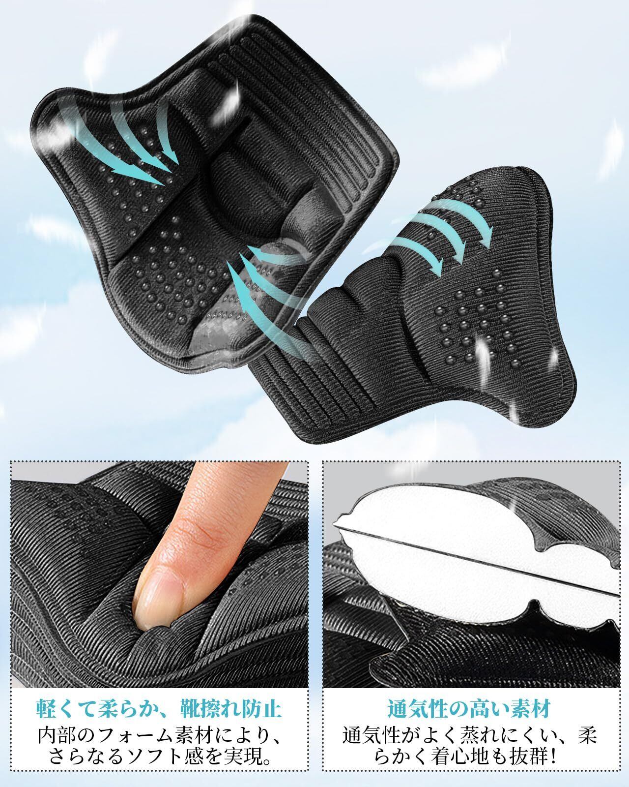 【薄型通気で目立たず快適】薄手で通気性に優れた素材を使用。蒸れや違和感が少なく、ビジネスシューズからカジュアルシューズまで、幅広いシーンで目立たず自然にご使用いただけます。長時間履いていてもストレスを感じさせない、軽く快適な着用感が特徴です