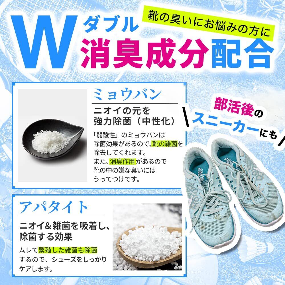【W消臭成分配合】ミョウバンによって靴の悪臭の原因を強力殺菌、臭いの元から断ちます。アパタイトによって靴の中に発生した匂いと雑菌を吸着して除去します。除湿までしてさらに清潔に!除菌もできる靴用消臭剤になっております。