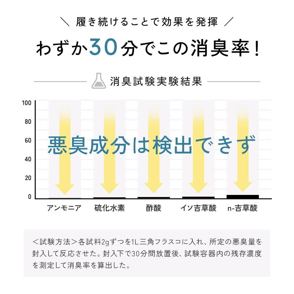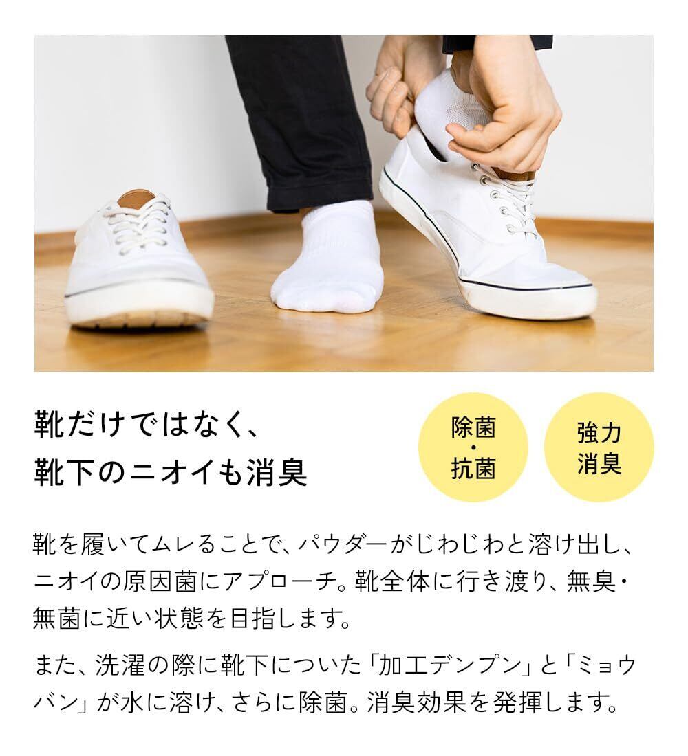 ミョウバン・柿タンニン・サイクロデキストリンのトリプル消臭成分で強力消臭。 わずか30分で効果を発揮し、アンモニアや硫化水素などの不快な靴の臭いを消臭します