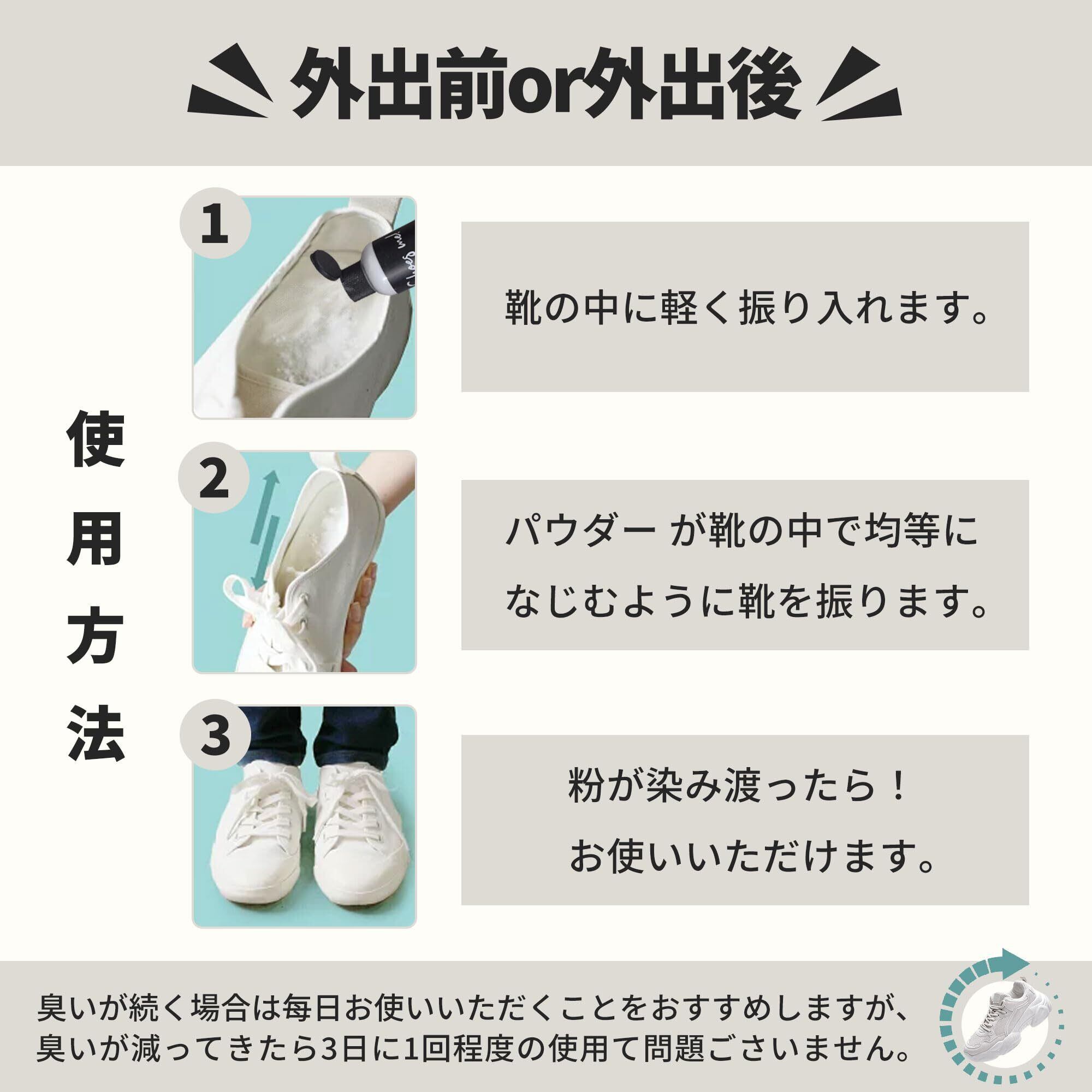 【誰でも簡単!ひと振りで快適ケア】 靴の中に軽く振りかけるだけで、すぐに消臭と抗菌効果を実感。日常のケアにも手軽に取り入れられる便利な消臭パウダーです。