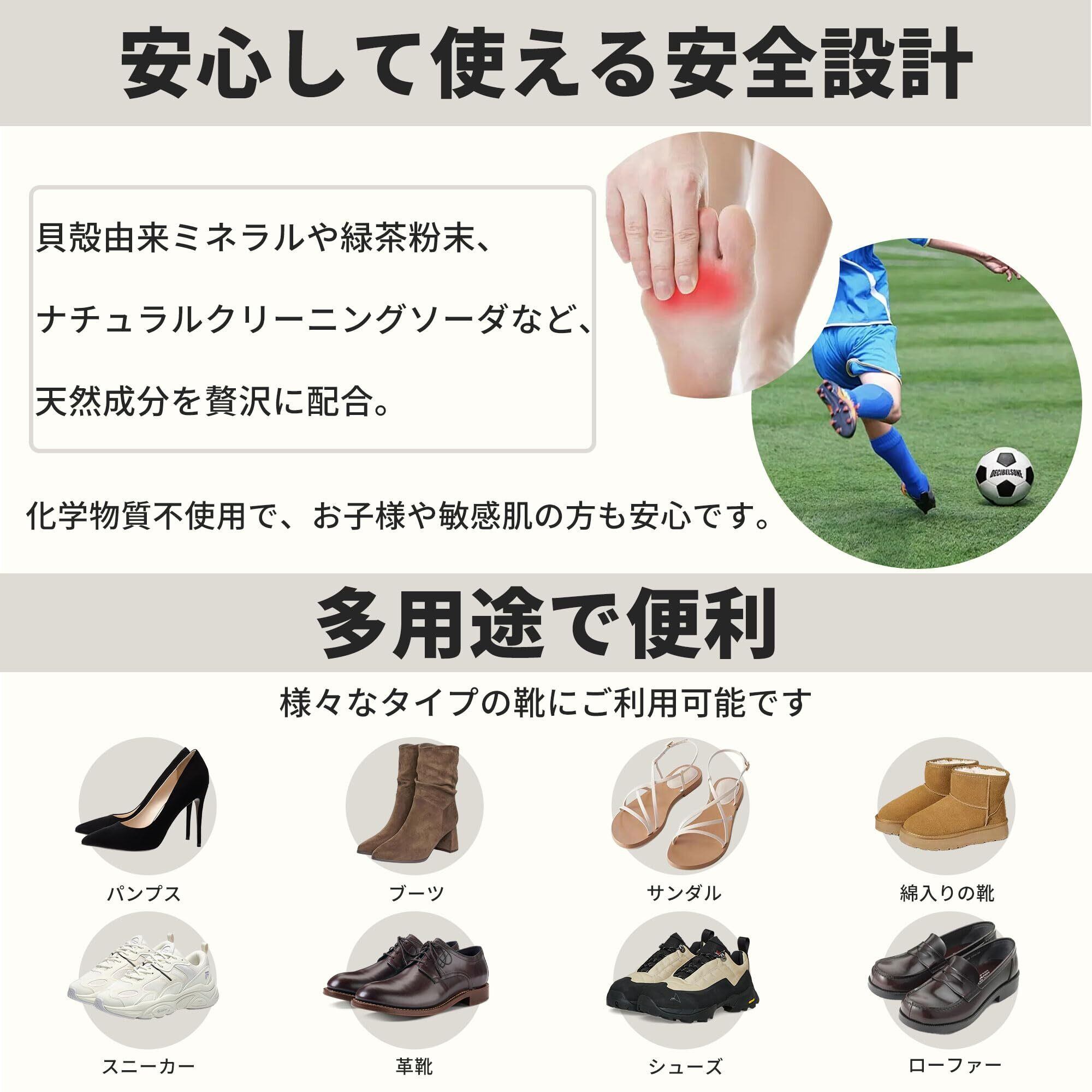 【天然成分の力で足元を快適に保つ新習慣】 エコミネラルブレンド(海洋由来ミネラル+ナチュラルクリーニングソーダ+緑茶カテキン)を使用した消臭パウダー。靴や足元のニオイを根本からケアし、清潔で爽やかな毎日を実現します。