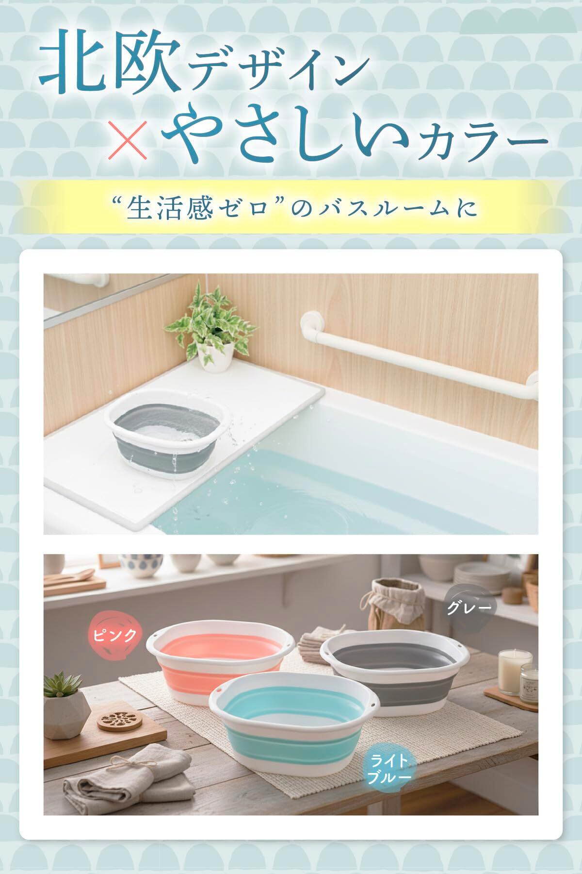 【おしゃれな北欧カラーで生活感を抑える】 おしゃれな北欧カラーを採用し、出しっぱなしでも生活感が出にくいデザイン。洗面器やバケツにありがちなチープさを抑え、浴室や洗面空間に自然になじみます。