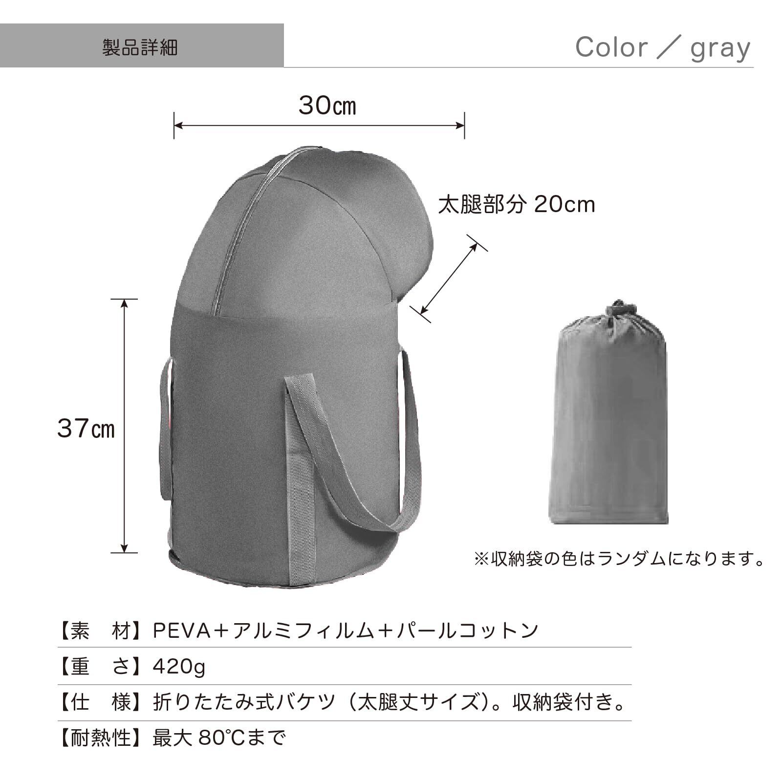 【サイズ:素材】太腿丈サイズ。保温力が高いPEVA+アルミフィルム+パールコットン【サイズ】30*30*37cm/重さ:420g。ふくらはぎ部分20cm。【仕様】折りたたみ式バケツ。収納袋付き。バケツの耐熱性:最大80℃まで