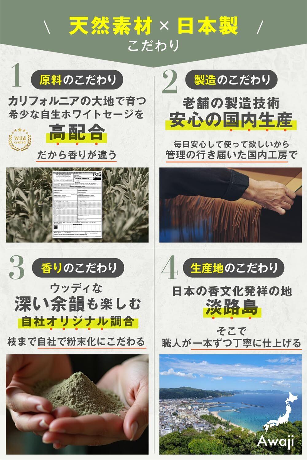 【100%天然素材・日本製の安心品質】合成香料・着色料不使用。国内の老舗香工房で職人が一本ずつ丁寧に手作りした、身体にも空間にもやさしい浄化アイテム。
