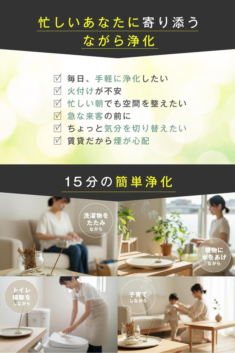 【 多彩なシーンで活躍する癒しアイテム】お掃除後・寝る前・仕事の合間・来客前・瞑想やヨガの時間など、毎日のさまざまなタイミングで簡単に使えるリフレッシュ香。