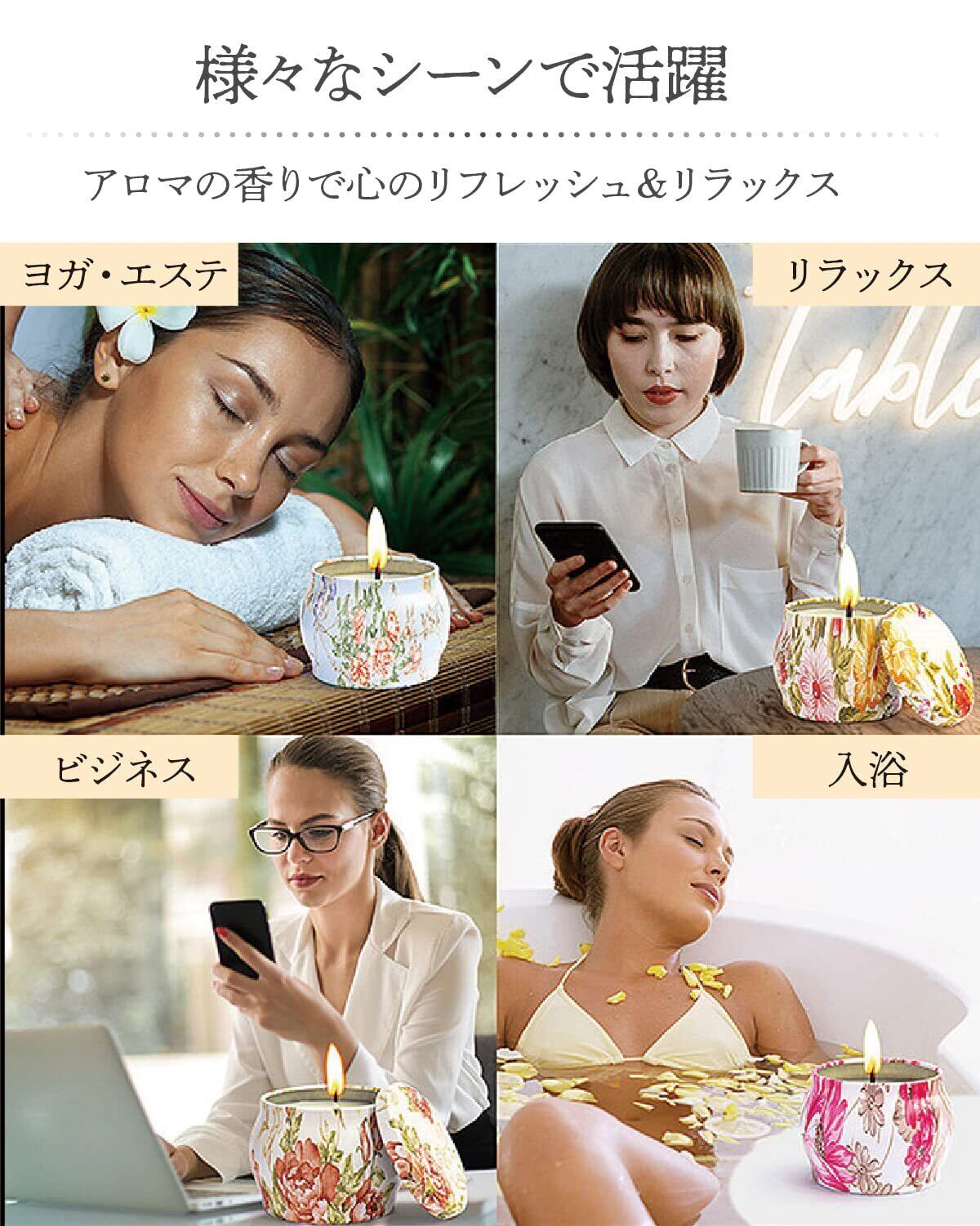 【プレゼントにも最適】 アロマキャンドルはストレスを解消してリラックスすることができ、ギフトやプレゼントとしても喜ばれるアイテムです。多くの場所での使用に適しており、リラックスタイムの使用はもちろん、入浴、ヨガ、オフィスなど、様々なシーンで快適な雰囲気を作り出す事が出来ます。また美しいデザインのブリキの容器は使用後にも小物ケースや小さな植木鉢などに最利用する事が可能です。