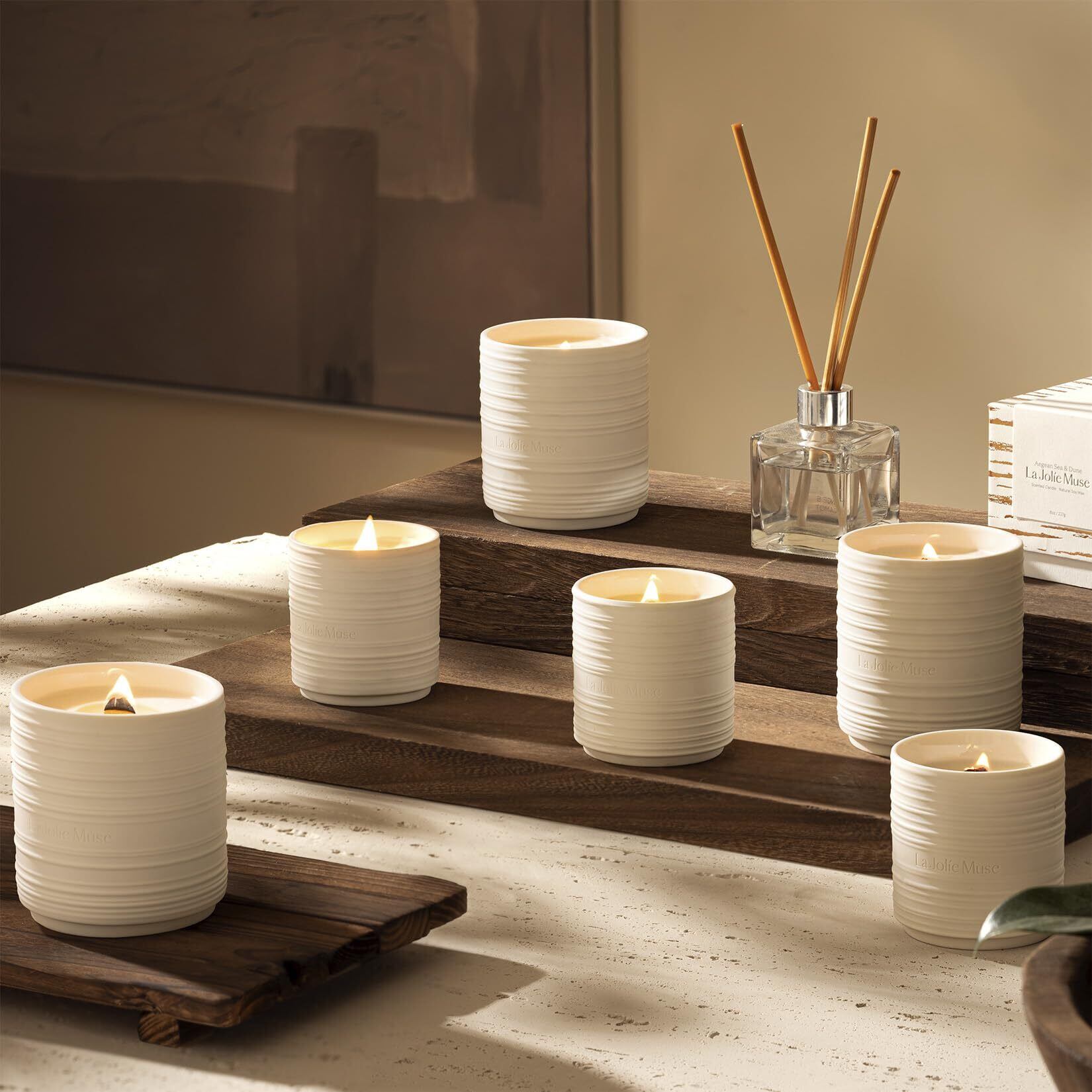 セラミックジャーキャンドル-水紋を施したキャンドルジャーに自然素材のワックスとウッドウィック。キャンドルを灯して自然由来のヒーリング効果をお楽しみください。