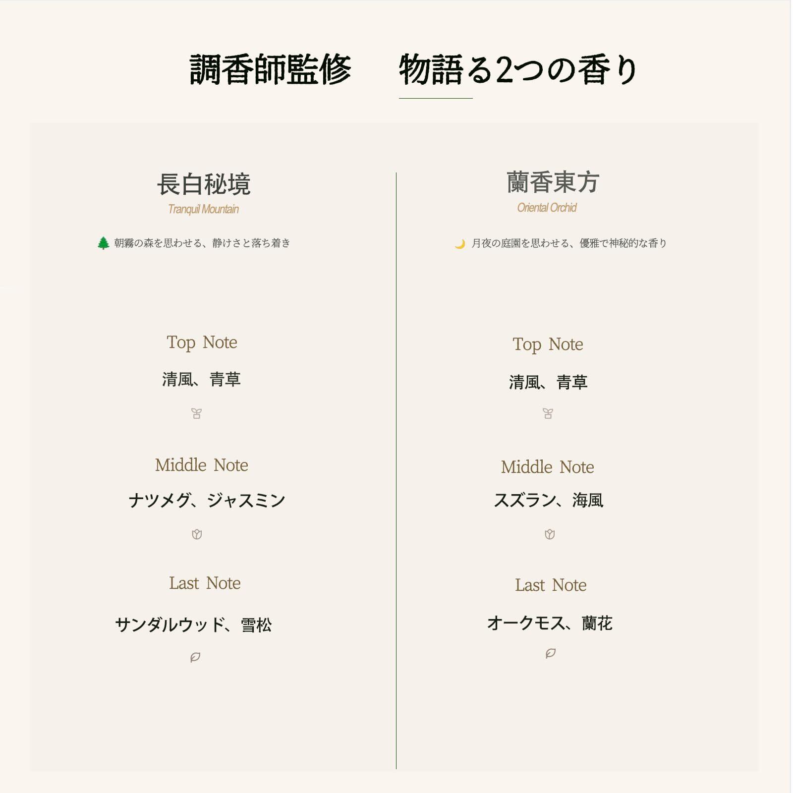 物語るオリジナルブレンド | 調香師監修の香り まるで情景が浮かぶような2つの香り。「長白秘境」は朝霧の森の静けさ、「蘭香東方」は月夜の庭園の優雅さ。調香師監修の唯一無二のフレグランス