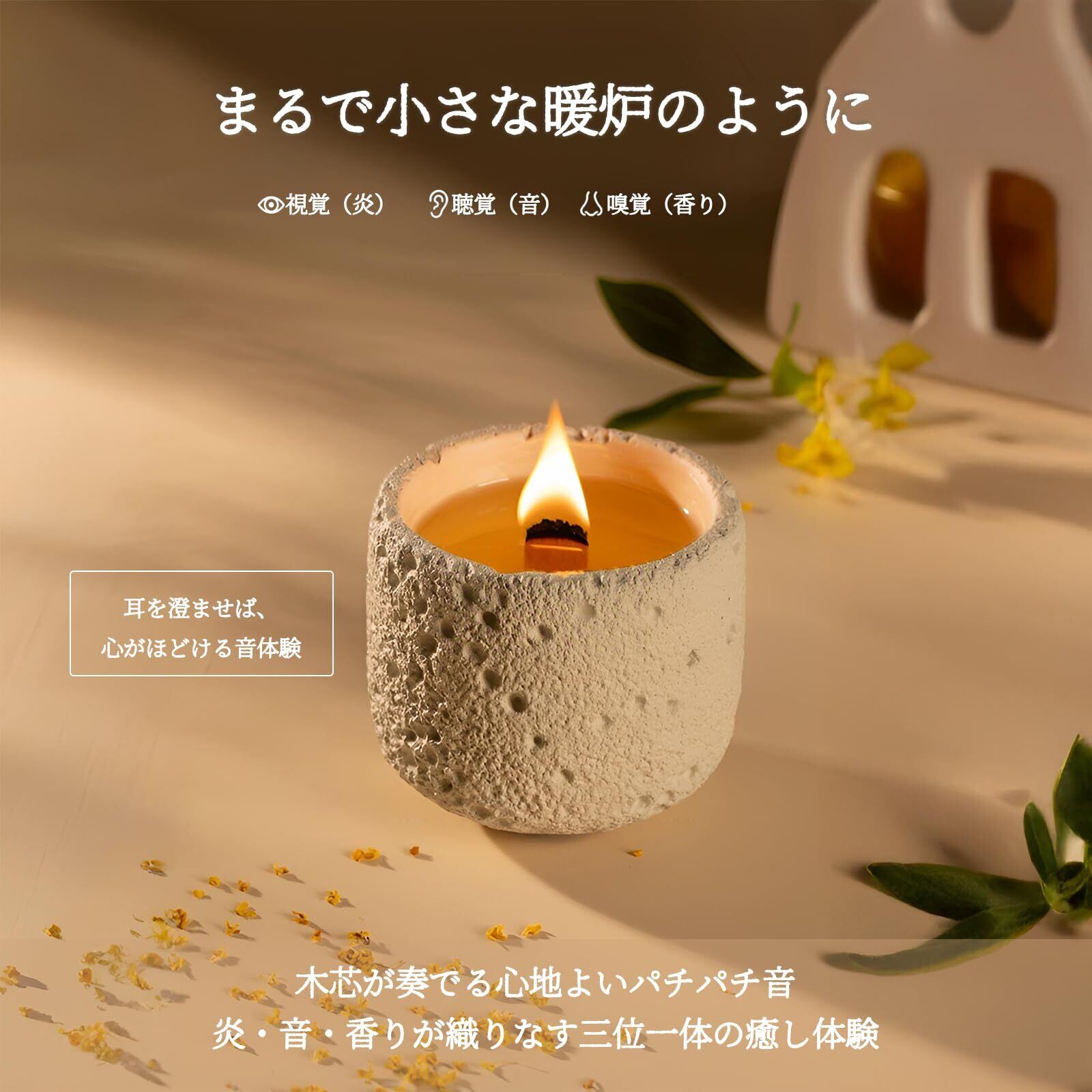 焚き火のような癒しの音 | 特別なウッドウィック体験 木芯が「パチパチ」と奏でる音は、まるで小さな暖炉。炎の揺らめきと音に包まれ、目を閉じれば日常の喧騒を忘れさせてくれます