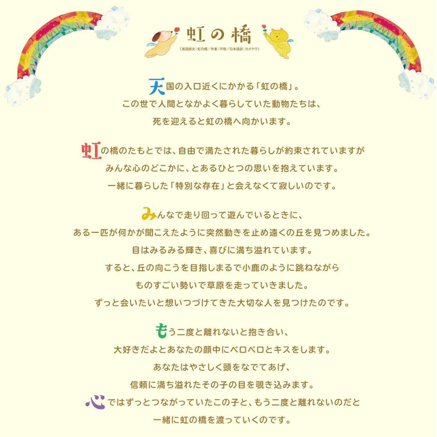 たくさんの人をペットロスから救ってきた『虹の橋』という物語をもとに生まれたペットローソク『虹のかなた』です。