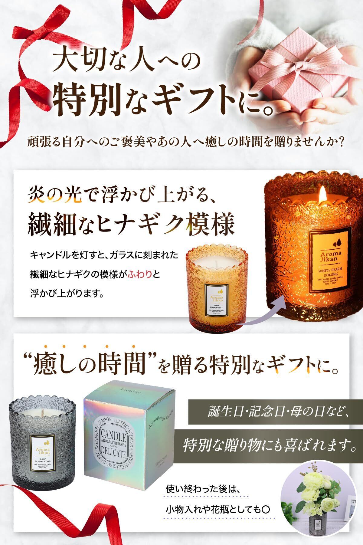 ・【お気に入りの香りをお選び下さい】:アロマキャンドルの炎には、副交感神経を刺激する効果があり、リラックスを促す作用が期待出来ます。また、炎の揺らぎは「1/fゆらぎ」と言われ、心を落ちつかせる作用があると言われています。下記のフレグランスを御用意しております:Mokuren(木蓮)、BerriesRose(バラ)、WhitePeachOolong(白桃ウーロン)、Lavender(ラベンダー)、BlackCedar&Juniper(森の香り)、LimeBasilOrange(ライムバジルオレンジ)、Sandalwood(白檀)、Kinmokusei(キンモクセイ)、Jasmine(ジャスミン)。