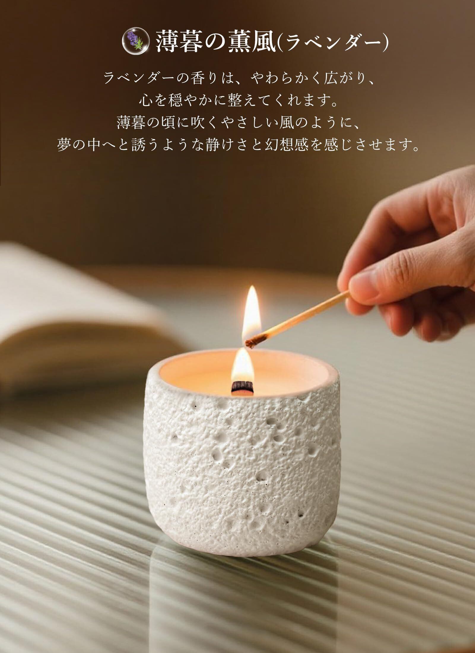 【天然ソイワックス使用|アロマキャンドル】 植物由来のソイワックスは、やわらかな火とともに、クリーンな香りを届けます。煙が少なく、燃焼時間も約35時間と長持ち。