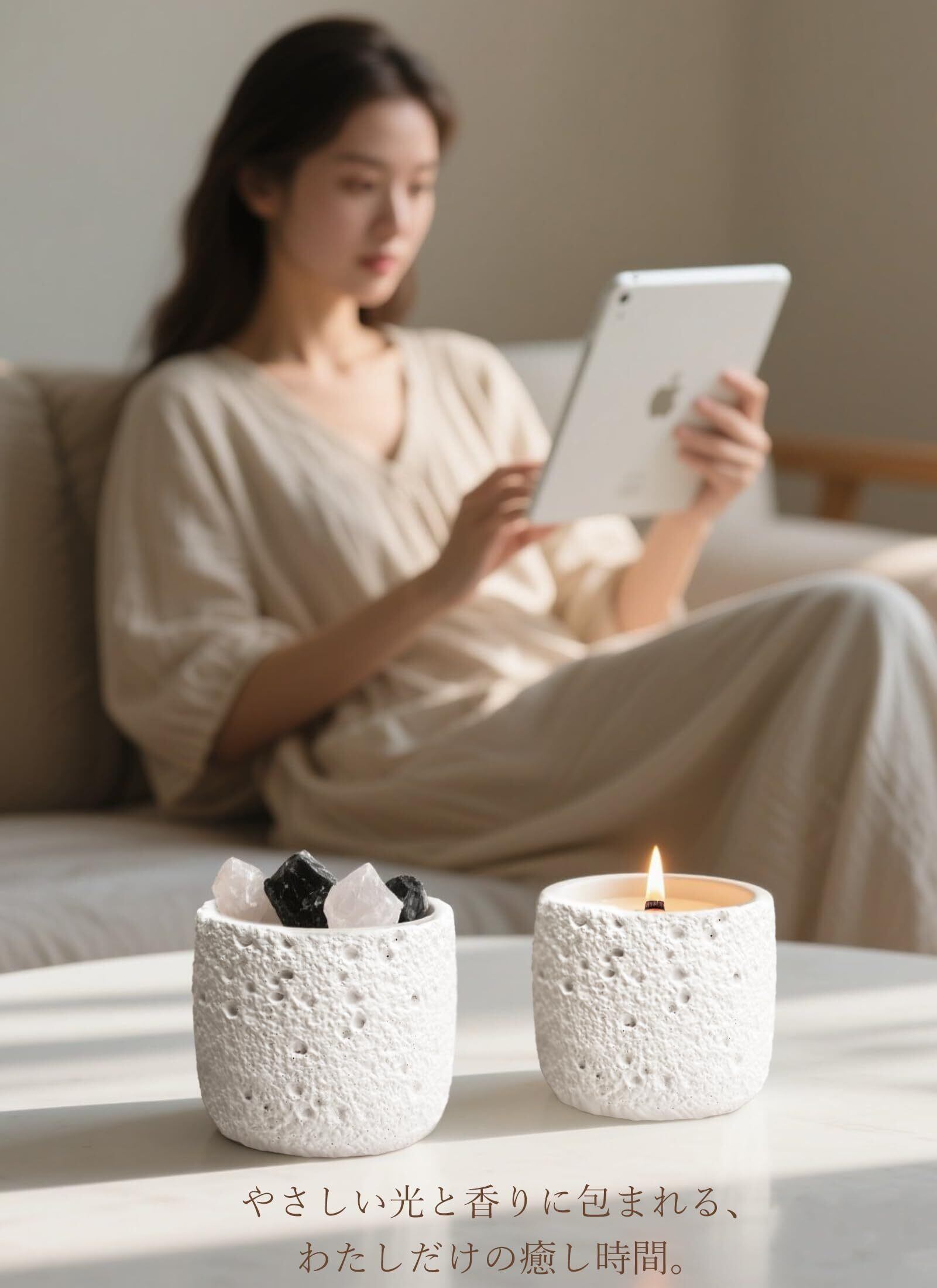 【日常に香りの癒しを|読書・ヨガ・バスタイムにも】 朝のストレッチやヨガの時間に。午後の読書や音楽を楽しむひとときに。夜のバスタイムや就寝前のリラックスルーティンに。そっと灯すだけで、香りが空間と気持ちを整えてくれます。日々の「自分時間」に、心地よい香りを添えて。