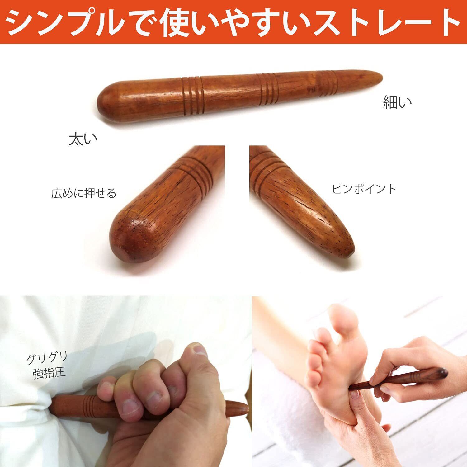 ・ピンポイントで足裏・ふくらはぎ・肩・首・腰・肩・背中など気になる箇所を指圧できます ・素材:天然木(商品の木目、デザイン、サイズは全て異なります) ・ツボ押し棒の表面は、天然成分の木工用オイルにて仕上げ加工がなされています。目的はツヤ出し加工、乾燥防止、防虫となります。 ・すべてではありませんが色落ちしてしまう場合もございますので、クリーム等を塗っては拭き取り、を何度か繰り返すと馴染んでくるかと思います。 ・水洗いや洗剤洗いををして乾燥させると、表面が劣化してしまうことがありますのでご注意ください。