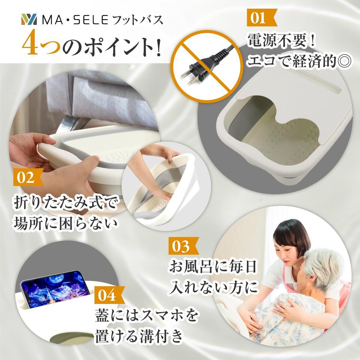 お湯と一緒にお気に入りのエッセンシャルオイルや入浴剤を混ぜるとより一層リラックスできます。フタにある窪み部分にスマホやタブレットを立て掛けることで、動画鑑賞やゲームも同時に楽しめます。自宅はもちろん、アウトドア・介護・災害時などすぐにお風呂に入れない環境でも身体を癒せるグッズです。