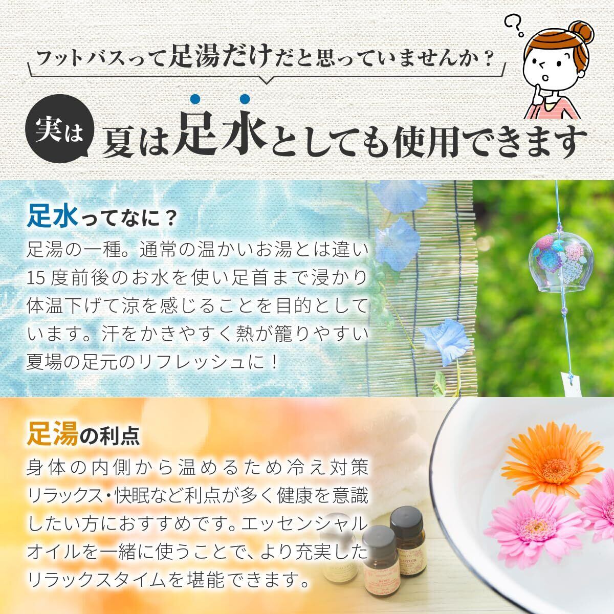 フットバスは足湯だけと思っている方も多いはず…夏場は水と氷を入れて足水としても使用できます。「足水」とは、通常の足湯とは異なり15度前後の水を使い足首まで浸かることで体温を下げて"涼"を感じることを目的としています。冷房や扇風機とは一味違う電気を使わない方法で涼んでみませんか?足を癒す以外に、衣類や靴のつけ置き洗い用のバケツとしてもおすすめです。