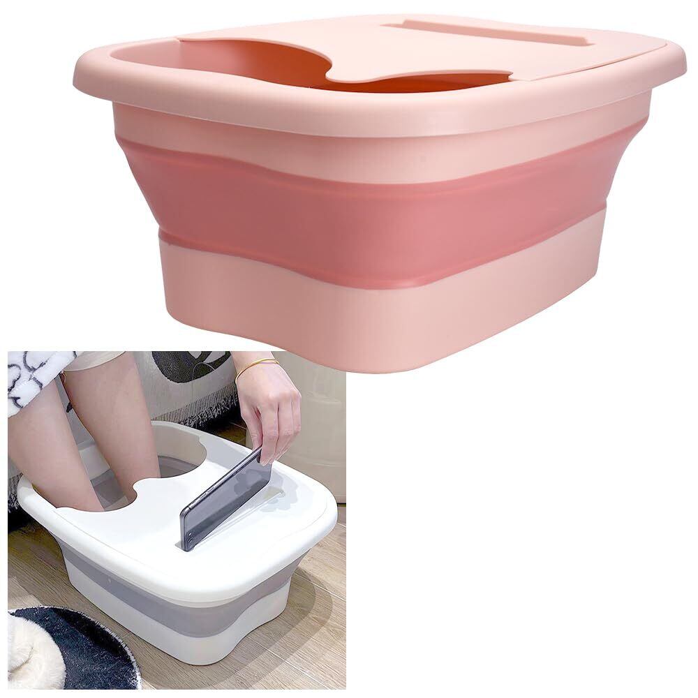 折り畳み式フットバス 足湯バケツ 持ち運び 蓋付き 保温 スマホスタンド アウトドア (ピンク)