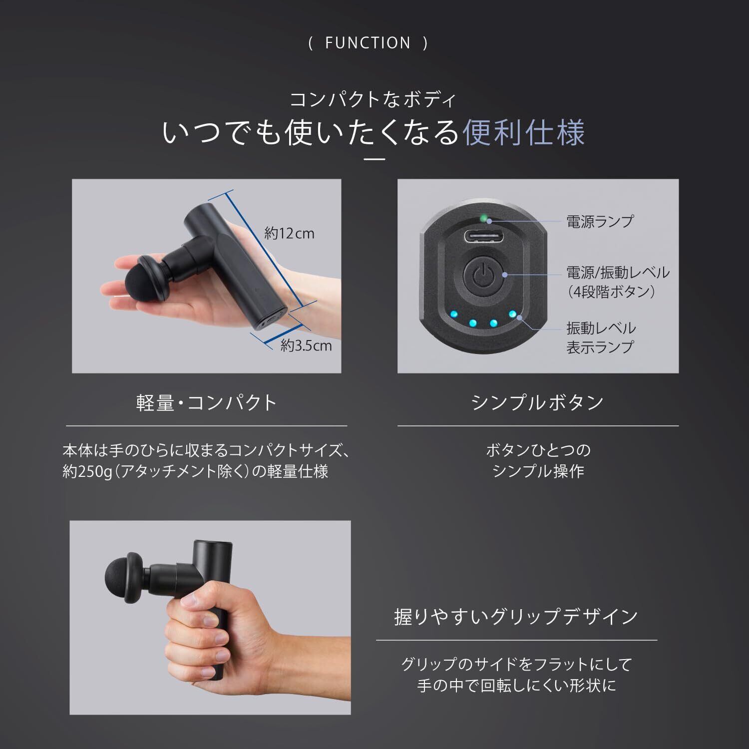 【コンパクトなボディにタイマー機能も いつでも使いたくなる便利仕様】軽量・コンパクト→本体は手のひらに収まるコンパクトサイズ、約250g(アタッチメント除く)の軽量仕様。シンプルボタン→ボタンひとつのシンプル操作。握りやすいグリップデザイン→グリップのサイドをフラットにして手の中で回転しにくい形状に。