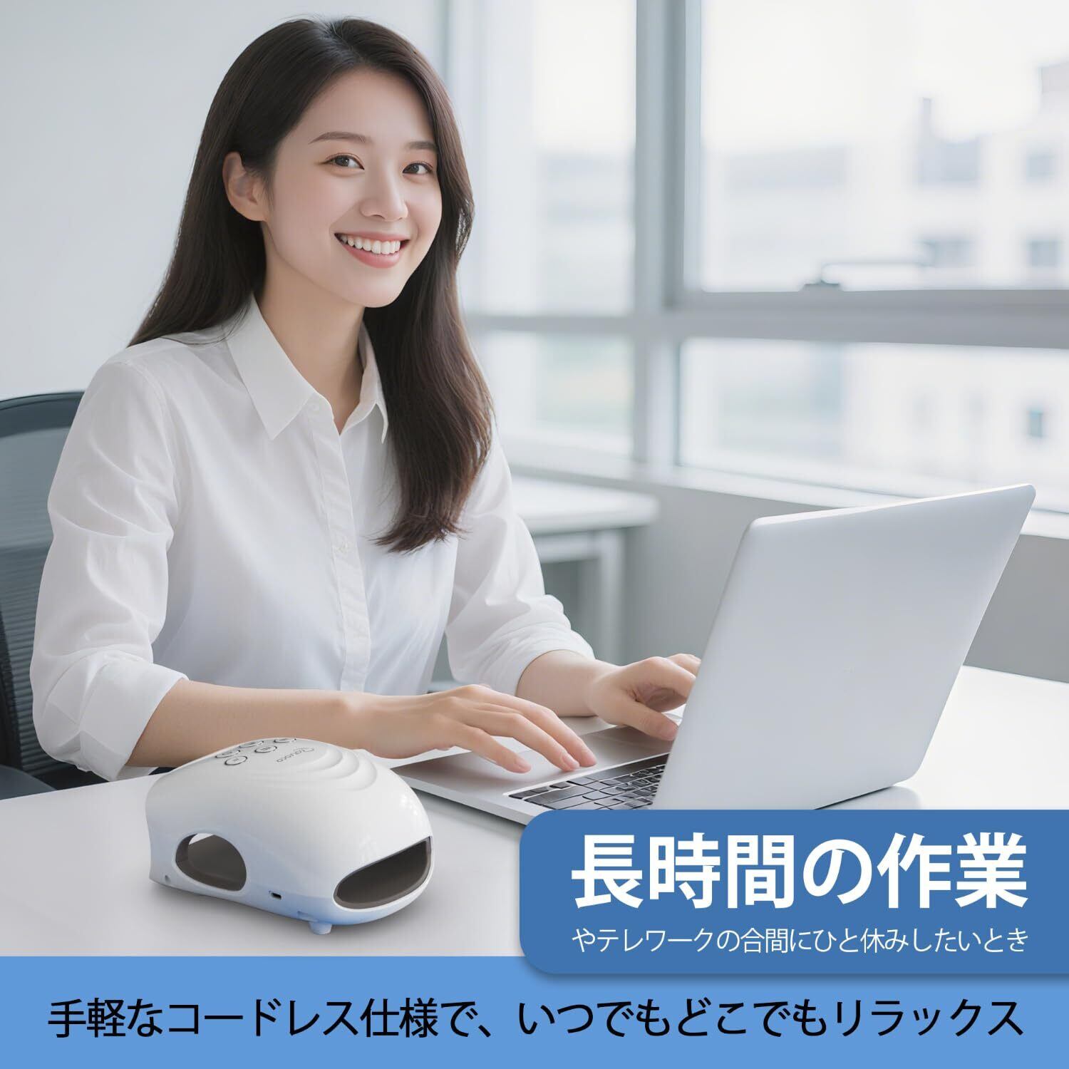 【3種類の揉み方と段階の加圧レベル】 3つのモードを搭載。指先を丁寧に揉みこみとリズミカルな加圧で、手全体のくつろぎをサポート。上下のエアバッグが指先から手首までを包み込む。また、エアバッグは3段階の強度調整が可能で、自分の好みに合ったリラックス体験が簡単に見つけられます。左右どちらの手にもフィットするデザインで、手のサイズに関係なく、男女問わず快適にご使用いただけます。長時間のスマホやパソコン作業後、家事や育児の合間、または寝る前のリラックスタイムに最適です。