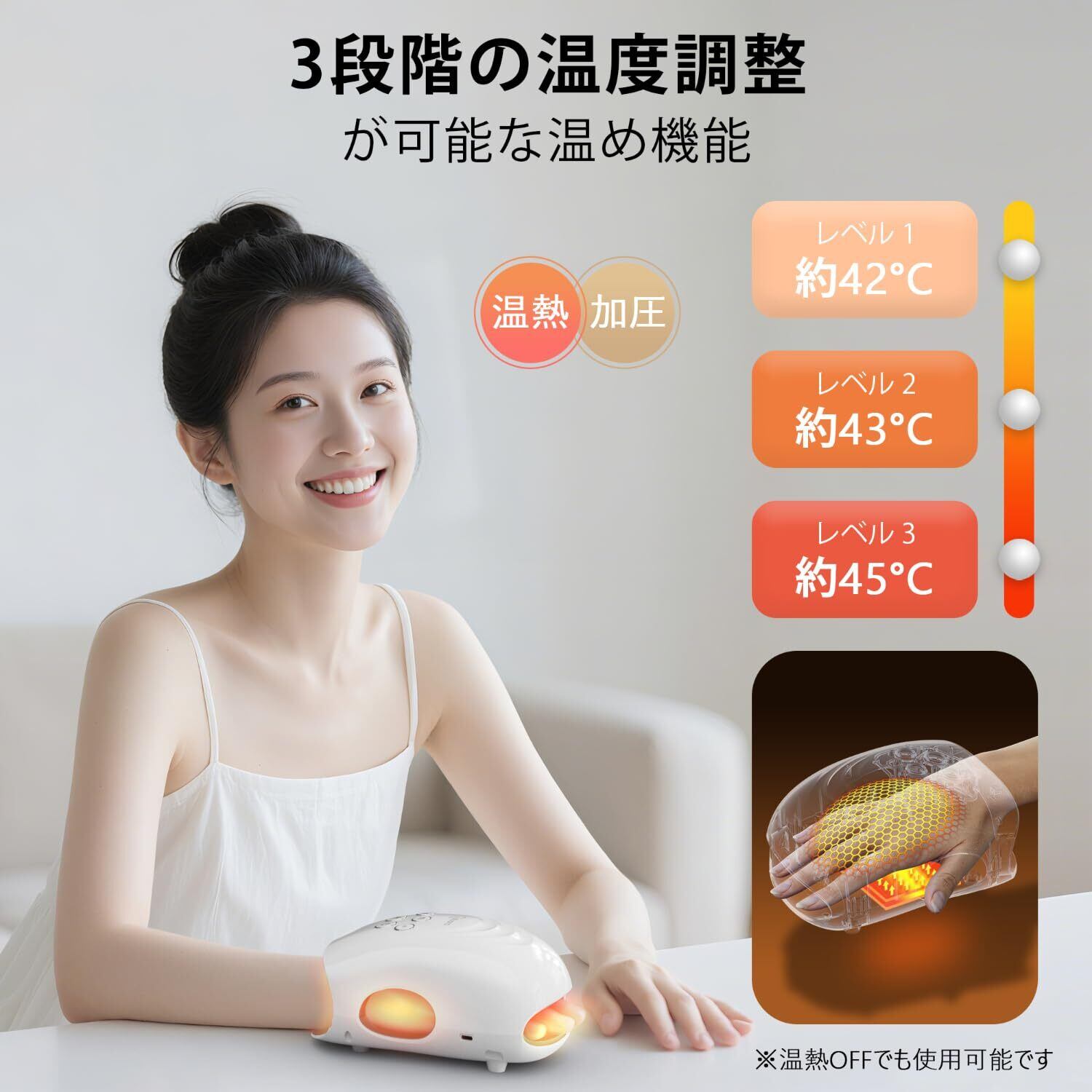 【3段階温度調整対策と日頃のハンドケア】じんわりと温かなヒーターを内蔵し、3段階の温度でその日の気分に合わせたお好みの温度でご利用できます。(※温熱OFFでも使用可能です。)また、乾燥や手荒れが気になる方にはハンドクリームを使用した後に本製品を使用することができます。