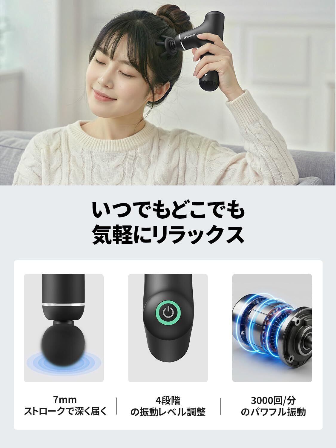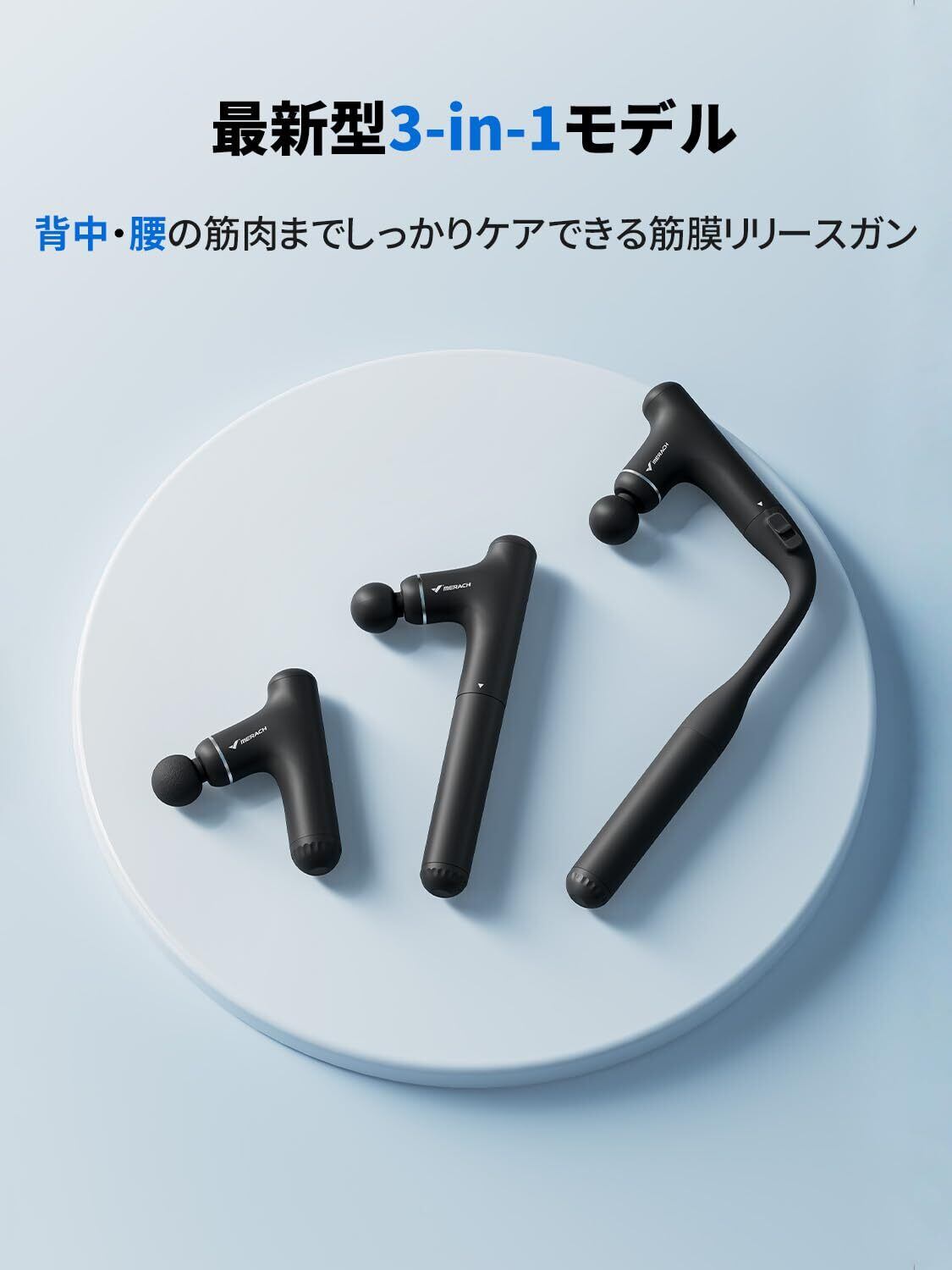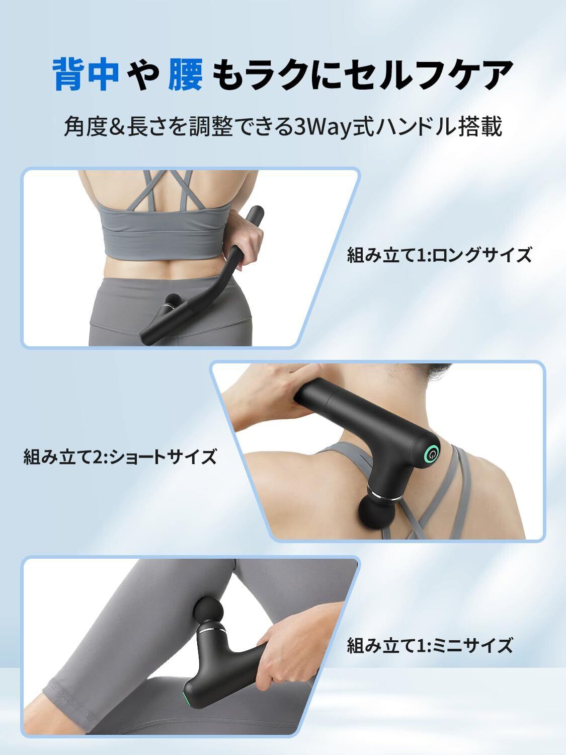 【3Way式ハンドルモード・全身のセルフケア体験】MERACH独自開発の筋膜リリースガンは、異なる組み合わせのハンドルデザインを提供し、さまざまな部位のリラックスニーズに柔軟に対応します。また、ハンドルを取り外してミニモードだけを使用できるため、収納が簡単で外出先でも手軽に使えます。①ロングハンドルモード:背中や腰の深いリラックスに最適。ハンドルがちょうどよく長くて、手が届きにくい部位にも簡単にアクセス。②ショートハンドルモードは、ふくらはぎや肩に適しており、姿勢を変えずに精密なケアが簡単に操作できます。③ミニモード:小型のアタッチメントと組み合わせて、腕や首、頭などの細部の部位までリラックス。