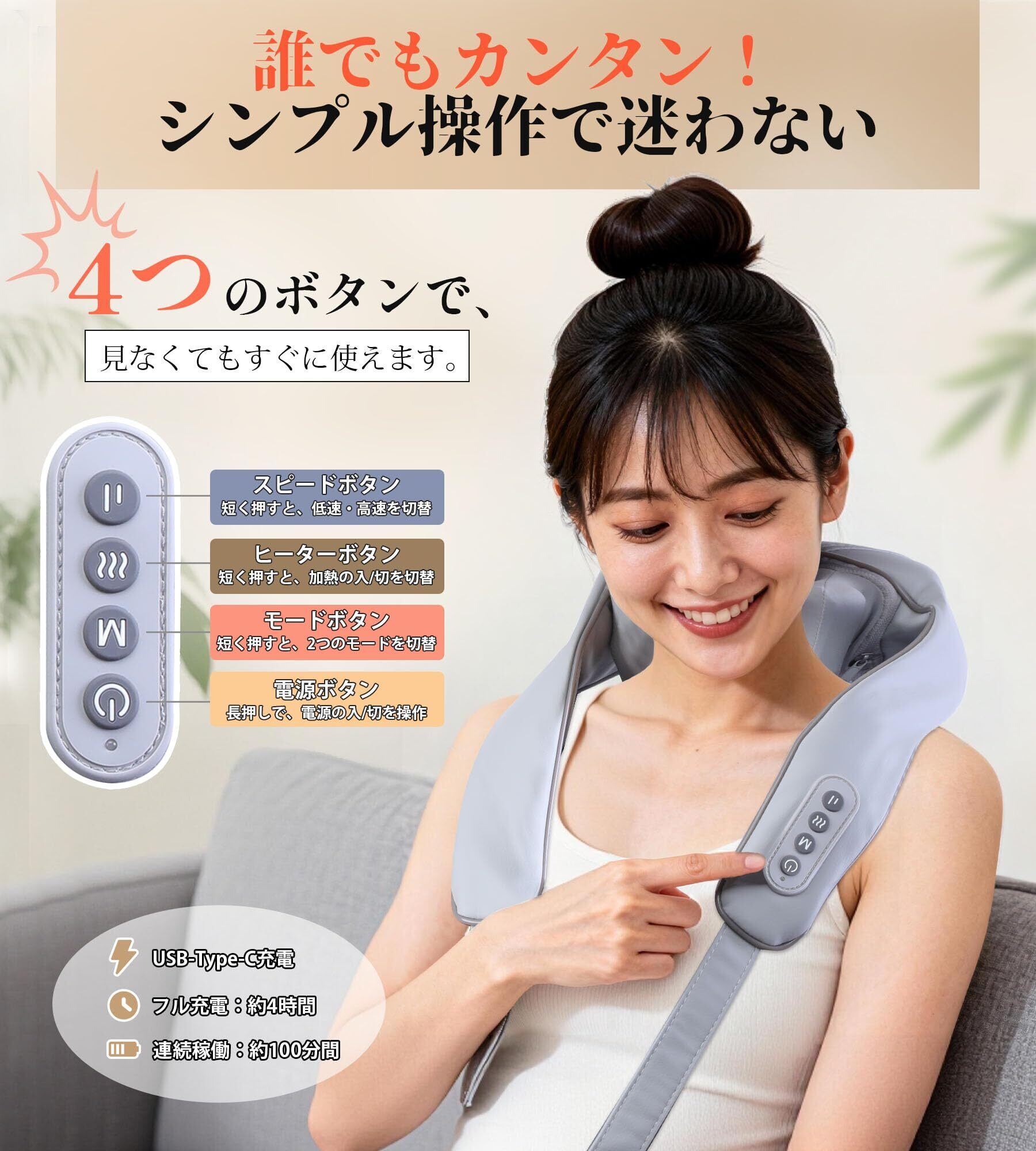 【コードレス仕様・ストラップで手軽に装着】このネックケアに2500mAhの大容量バッテリーを搭載し、1回の充電で最大150分間使用可能。Type-C充電に対応しており、モバイルバッテリーやスマホ、パソコンなどから手軽に充電できます。操作もシンプルで、ボタンを押すだけで操作が始めるし、ベルトのストラップはカチッと留めるだけの簡単装着で、すぐに固定でき、両手がふさがりません。初心者やご年配の方にも気軽にお使いいただけます。
