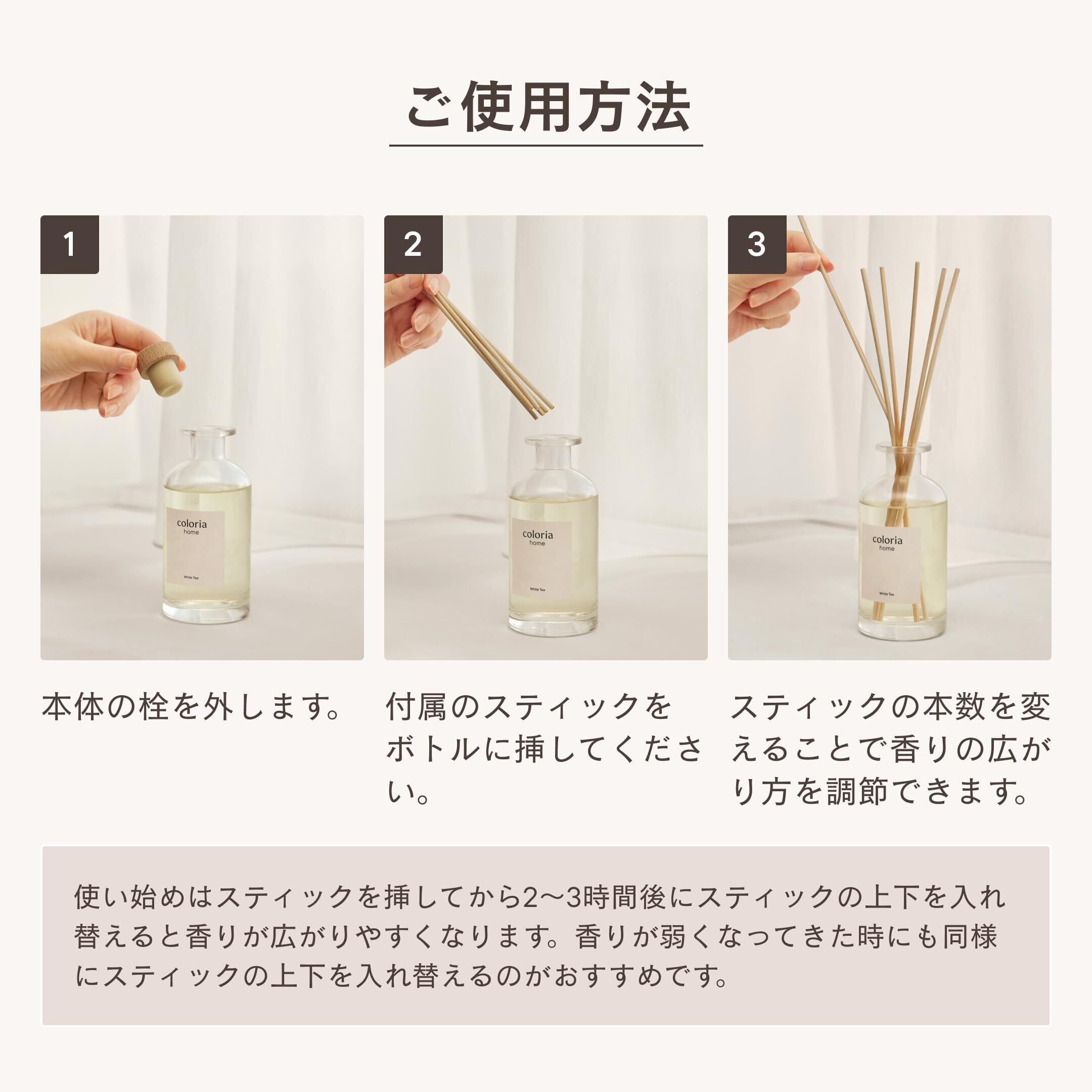 爽やかなホワイトティーの香り Coloria Home ルームフレグランス 180ml 約2.5ヶ月分 リードディフューザー スティック付き 芳香剤 部屋用 カラリアホーム ホワイトティー ギフト プレゼント | 毎日発送✿はなまる