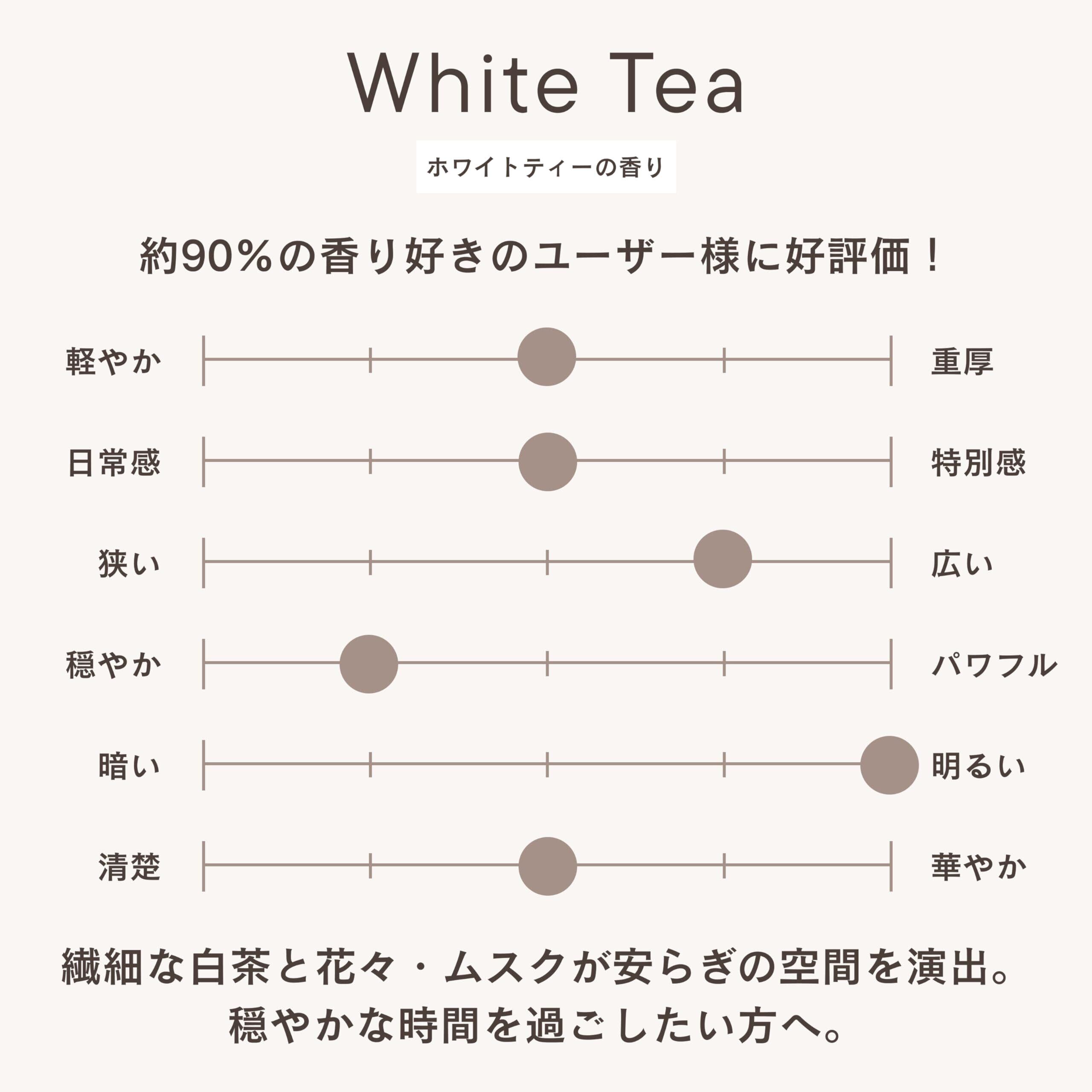 ✨【ティータイムの柔らかなぬくもりを空間に】ホワイトティーが織りなす柔らかで繊細な香りが、優しくお部屋を満たします。ティータイムを思わせる心地よさは、リラックスタイムを演出してくれます。