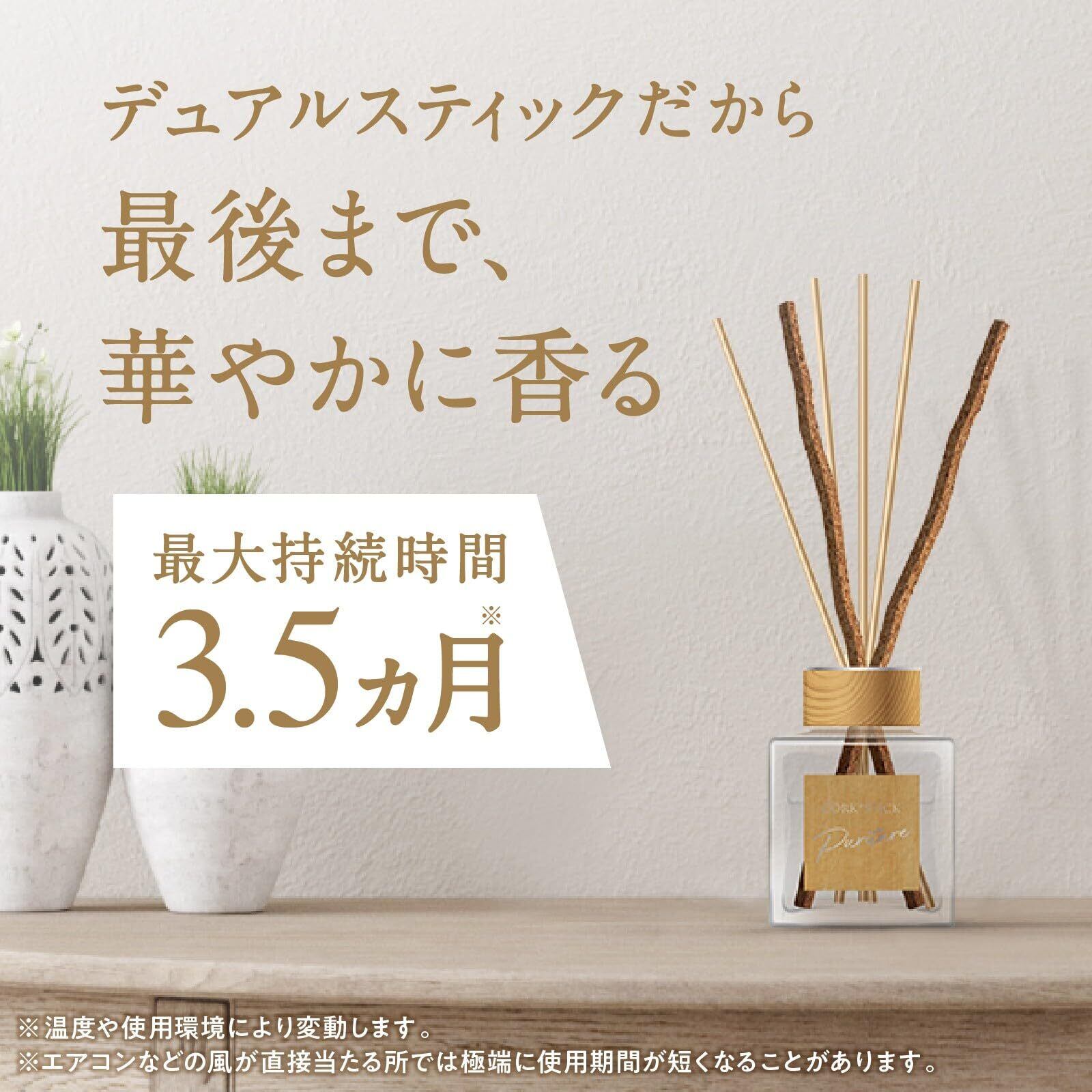 【最後まで香り弱くならないコルクスティック採用】樹脂製スティックと最後までしっかり香りを広げるコルクスティックを採用。2つの素材が奥ゆきのある香りを織りなし、使いはじめから使い終わりまで上質な香りを楽しめます。