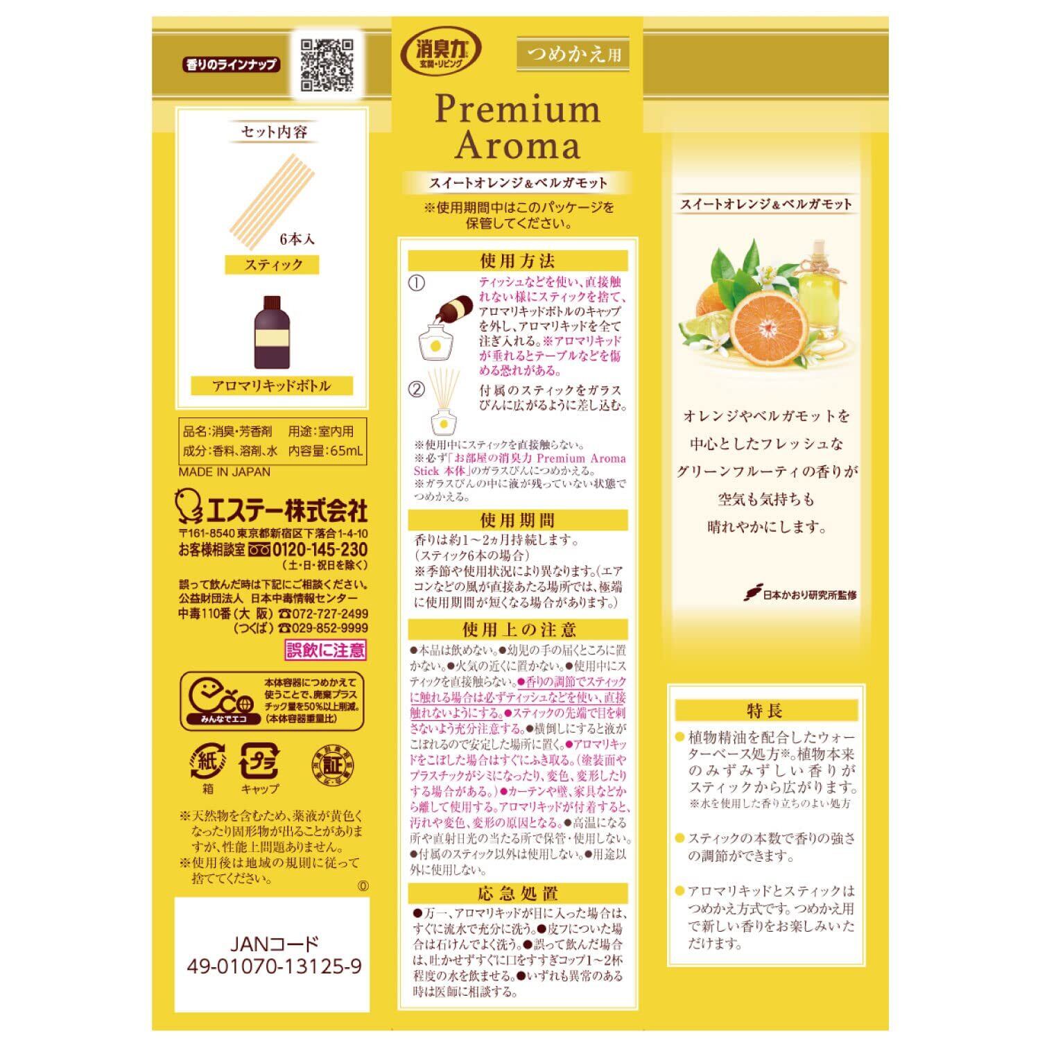 消臭力 プレミアムアロマ 部屋用 スティック スイートオレンジ&ベルガモット つめかえ 65mL×3個 ディフューザー 玄関 リビング ルームフレグランス 消臭 芳香剤