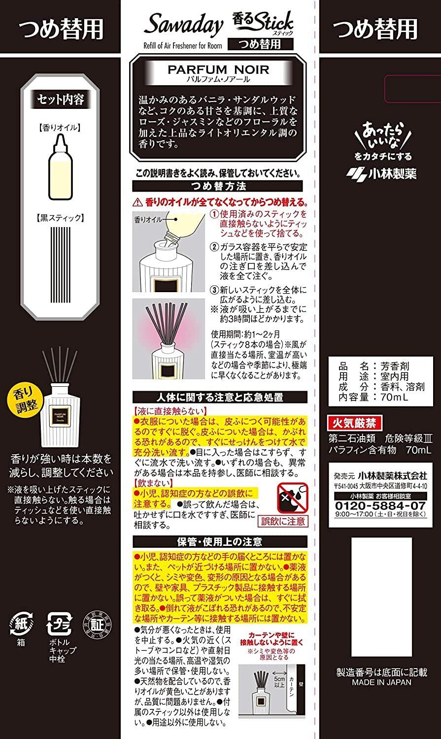 サワデー香るスティック パルファム ノアール 本体 70m + 詰め替え用 70ml 芳香剤 部屋用 ルームフレグランス フレグランスディフューザー リードディフューザー