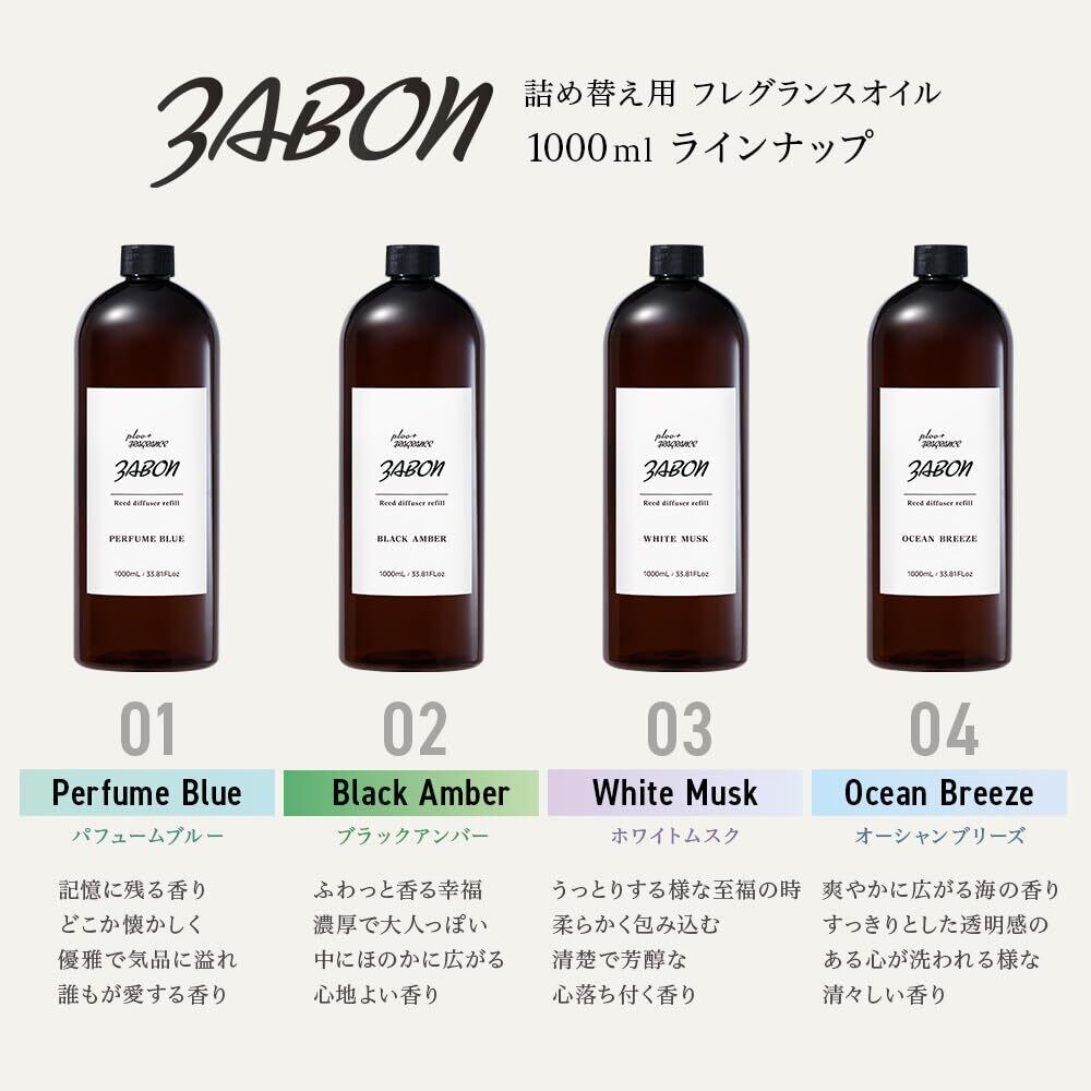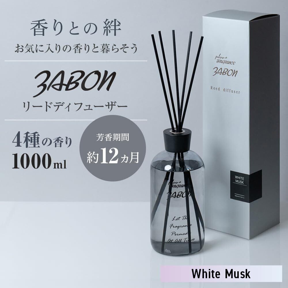 プルプラ ZABON リードディフューザー ルームフレグランス 1000ml 大容量 約12ヶ月分 芳香剤 スティック10本付き (ホワイトムスク)