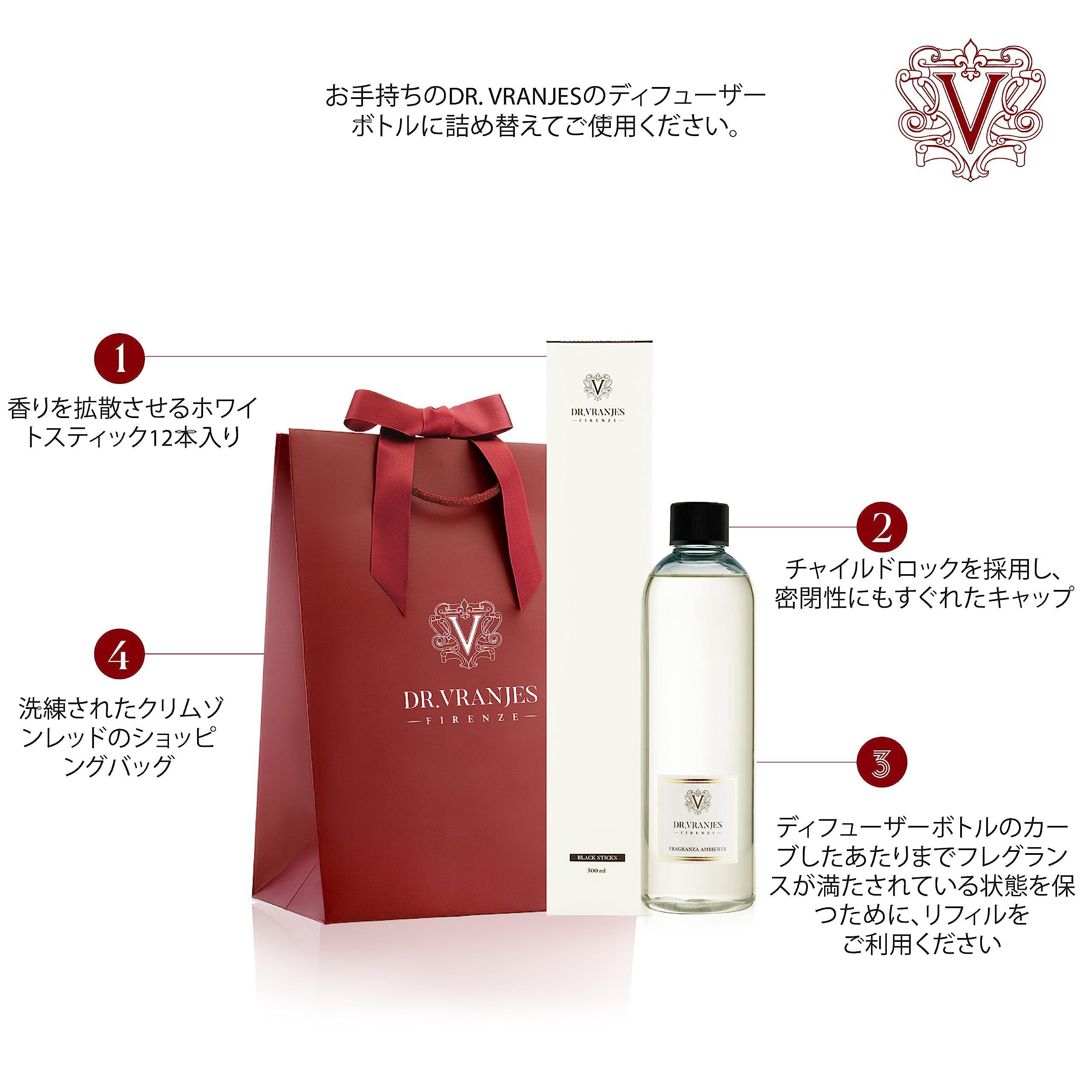 【香りをお楽しみいただくために】ディフューザーボトルが空になってから詰め替え用リフィルを注ぐのではなく、常にボトルのカーブしたあたりまで液体が満たされている状態を維持することをオススメしています。ボトルにリフィルを継ぎ足しながら使用いただくことでフレグランスが蒸発しにくくなり、安定した香りをお楽しみいただけます。※ガラスボトルは付属していないため、単品ではご使用頂けません。※お手持ちのDR. VRANJESディフューザーと同じ香りのリフィルをご使用下さい。別の香りとは混ぜないようにご注意ください。
