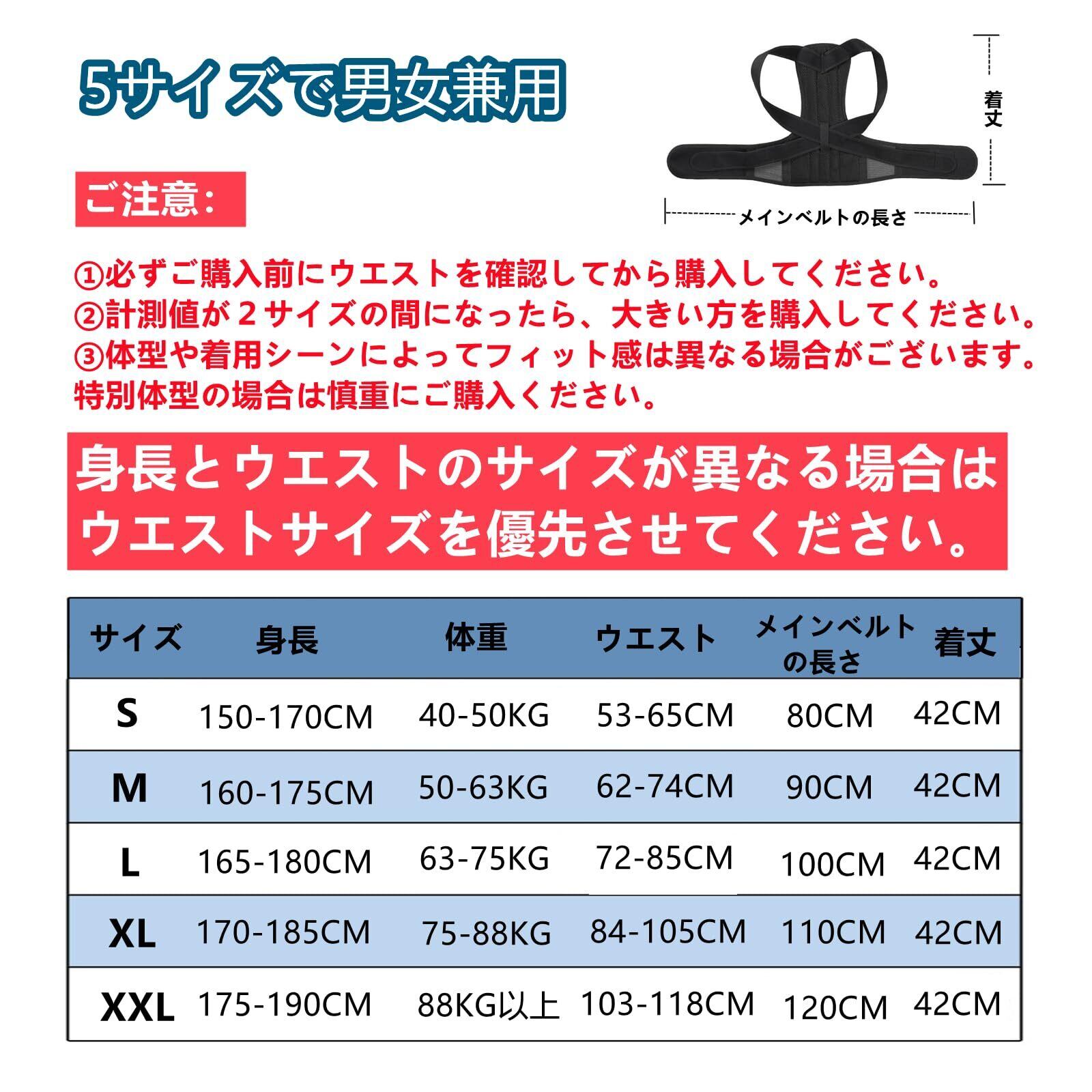 【男女兼用・サイズ選択可能】この姿勢サポーターは、腰の周囲のサイズに応じて五つの異なるサイズで提供されます。男女問わず、すべての体型に簡単に装着できます。S(ウエストサイズ53cm~65cm)・M(ウエストサイズ62cm~74cm)・L(ウエストサイズ72cm~85cm)・XL(ウエストサイズ84cm~96cm) ・XXL(ウエストサイズ107cm~118cm) ※必ずご購入前に腹囲を確認してから購入してください。計測値が2サイズの間になったら、大きい方を購入してください。身長とウエストのサイズが異なる場合は、ウエストサイズを優先させてください。