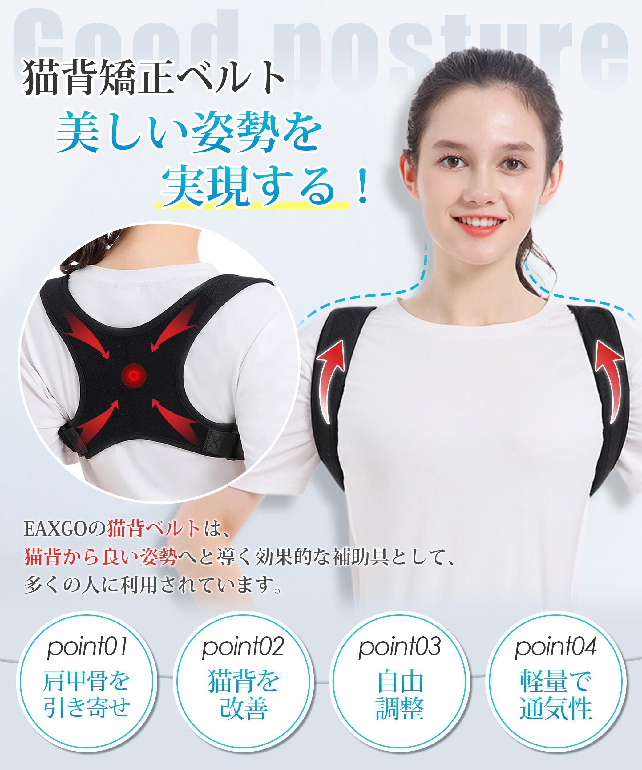 【理学療法士共同監修・猫背解消】猫背は、見た目だけでなく、健康にも悪影響を及ぼす可能性がある一般的な姿勢の問題です。この問題を解決するために、理学療法士は長年の研究と実践を経て、「猫背矯正ベルト」を開発しました。この製品は特別に猫背を矯正するための補助具として設計されています。EAXGOの猫背矯正ベルトを使用することで、人々は猫背を解消し、健康的で背筋の伸びた姿勢を形成できます。さらに、筋肉の緊張と疲労を改善し、血液循環を促進し、痛みと不快感を和らげる効果も期待できます。EAXGOが特別にデザインした猫背矯正ベルトを着用することで、簡単に猫背の悪い姿勢を解消し、シェイプアップ効果を楽しみながら健康的な体型を手に入れることができます。(※注:画像順に着用してください。製品の破損を回避し、使用不能にしないこと。)