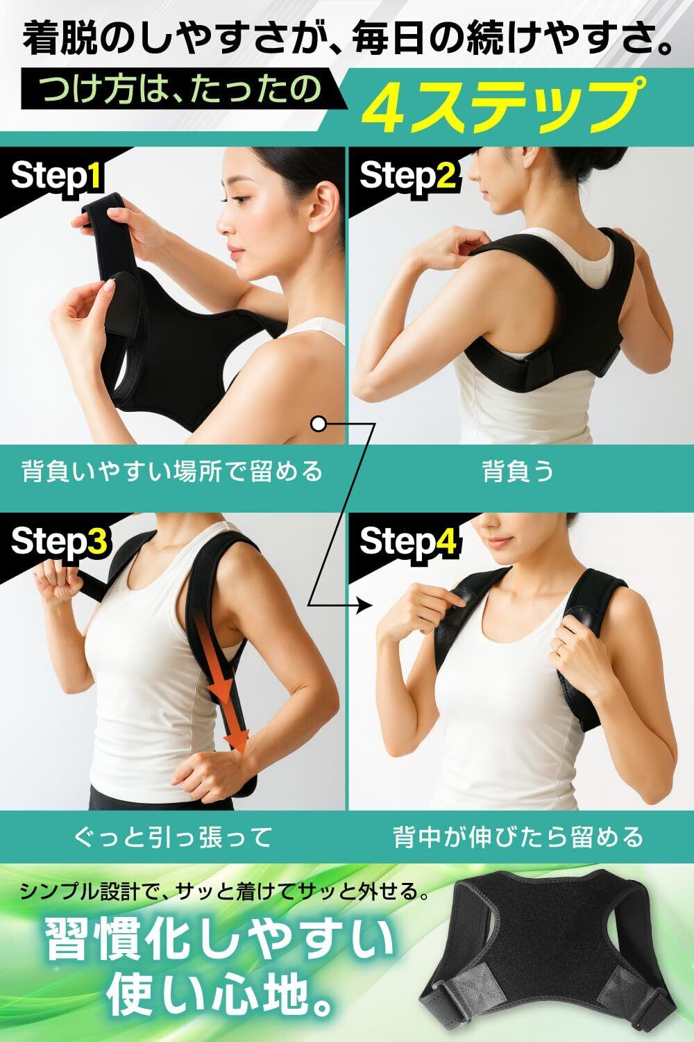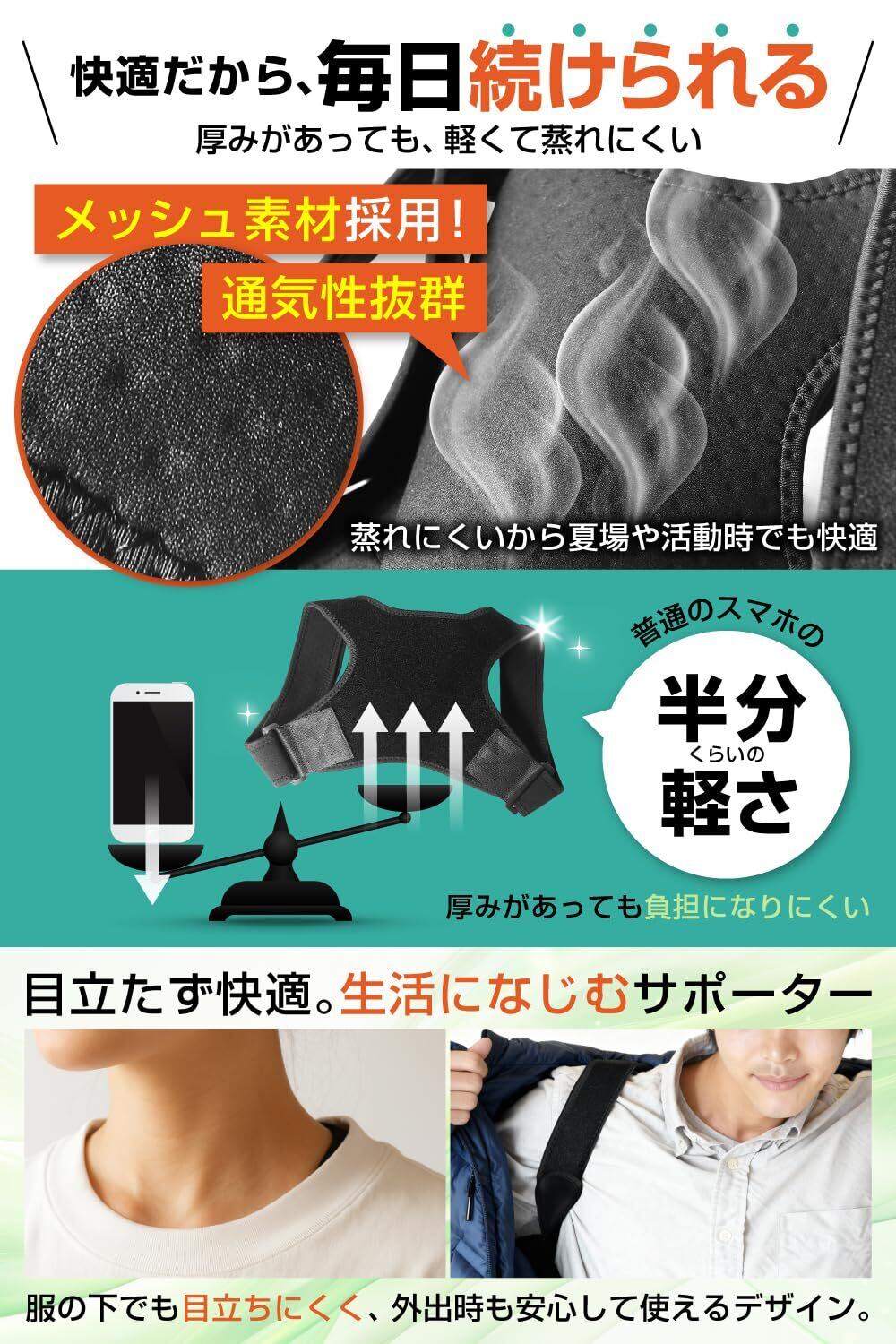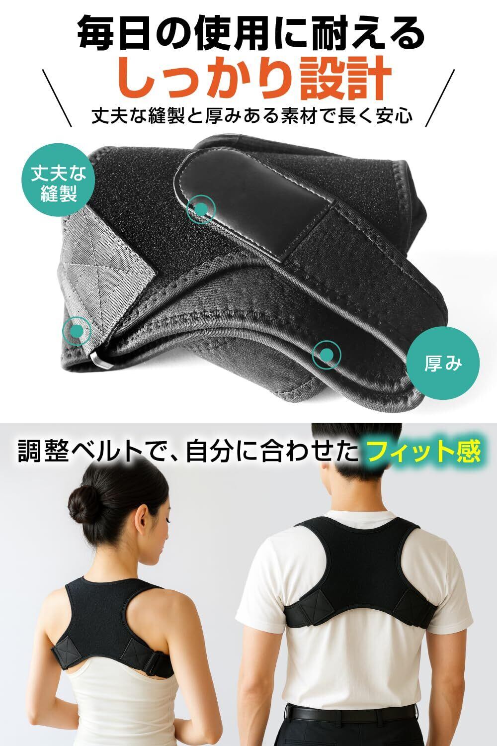 【調整可能】 伸縮性のベルトで、標準的な体型にぴったりフィット。猫背や巻き肩が気になる方におすすめです。