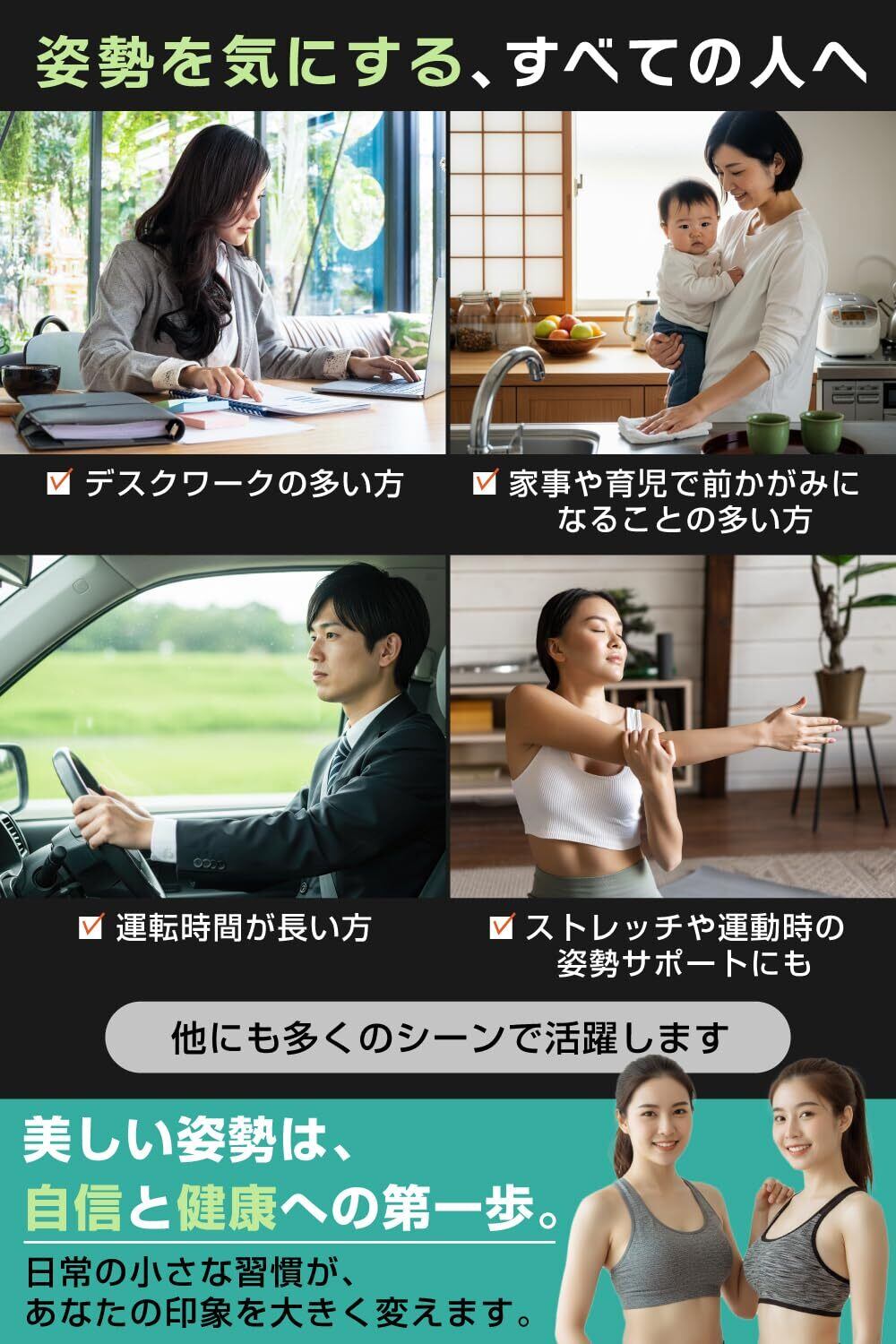 【幅広いシーンで活躍】 家事や運転、ウォーキング、ストレッチなど日常のあらゆる場面でお使いいただけます。