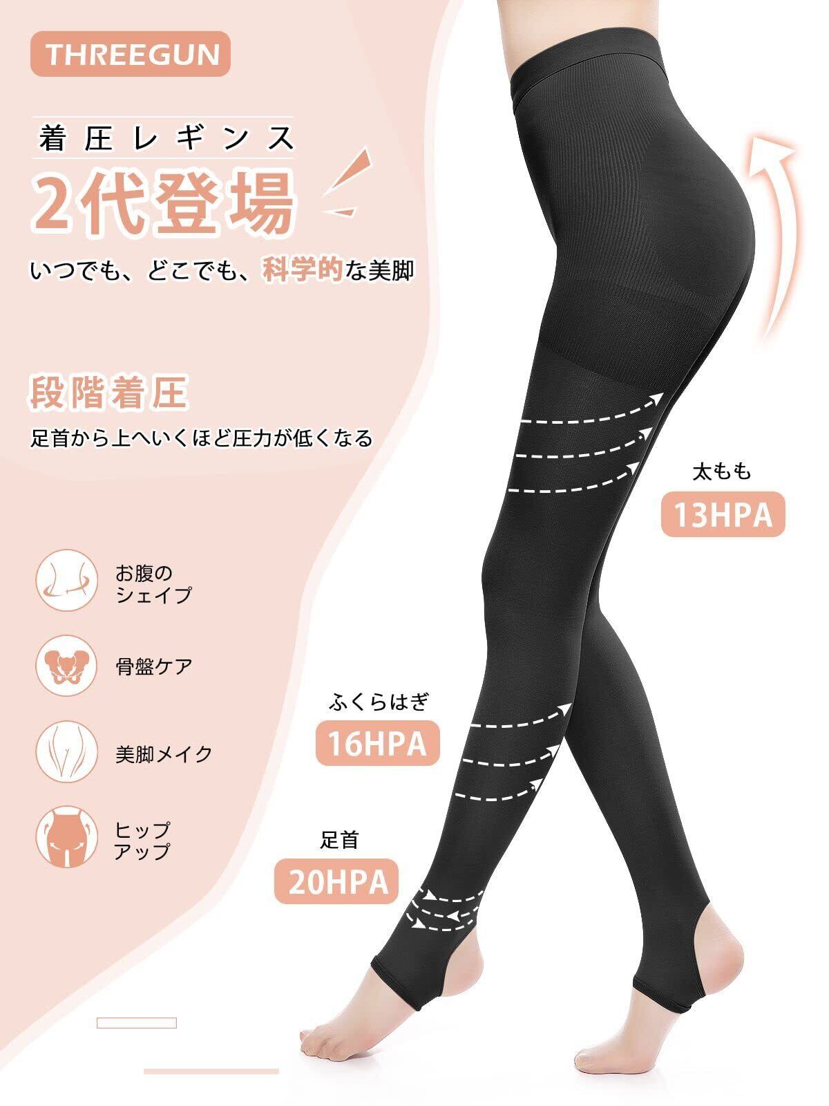 【THREEGUN着圧トレンカ】お客様の試着感想を合わせて、外形、材質を改良して、「お出かけタイプ」の着圧トレンカが誕生。圧力ゾーンをお腹/お尻、太もも、ふくらはぎ、足首部位に分けて、テーピング原理を応用して下半身をしっかりサポートします。