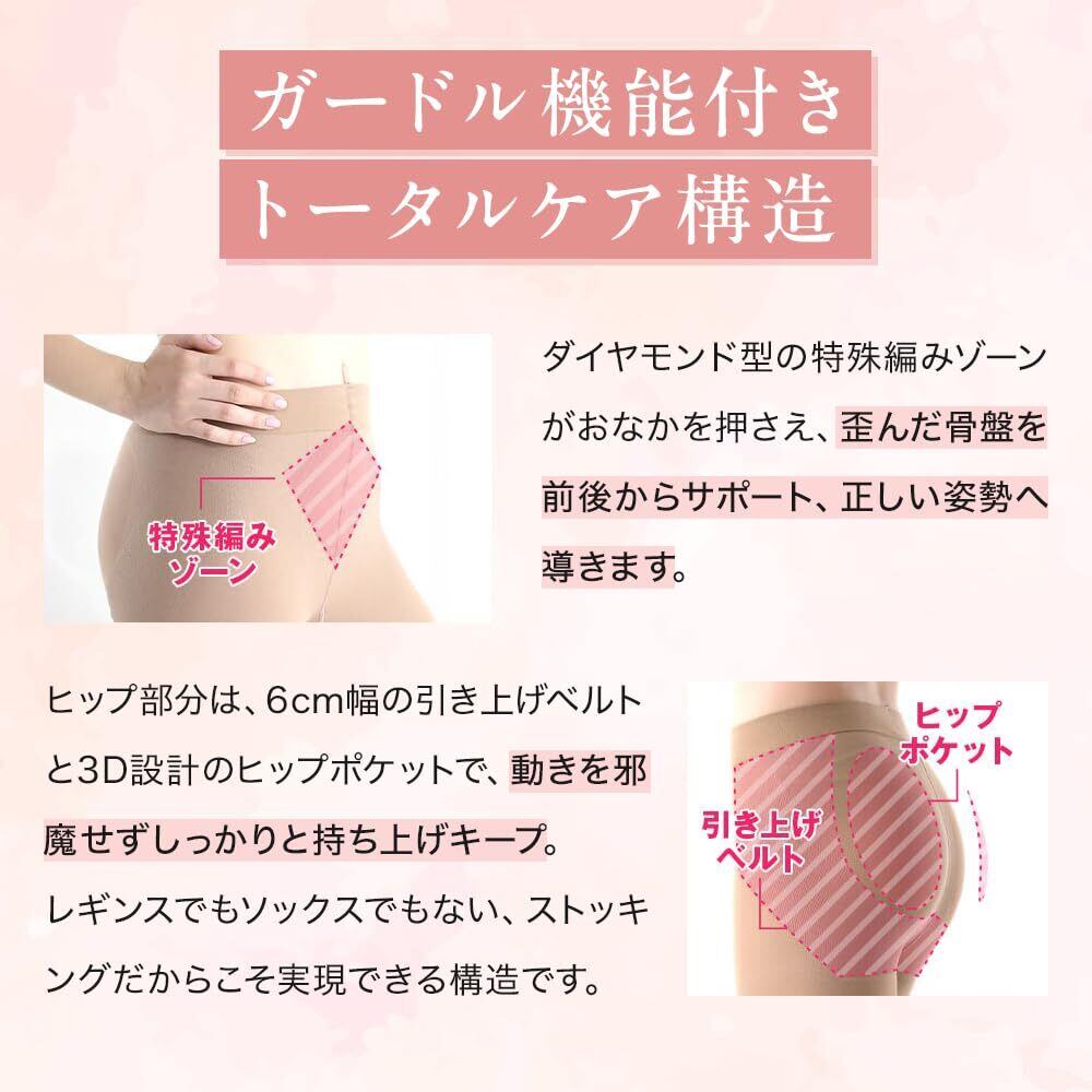 【履いた瞬間から骨盤のゆがみをしっかりケア】お腹を押さえつつ、ゆがんだ 骨盤 を前後からグッとサポートできるよう開発された 着圧ストッキング です。 ヒップ 部分もしっかりと持ち上げキープするため ヒップアップ 効果も期待できます。【 4段階 高着圧設計 】太ももから足首にかけて、適切な着圧力で足全体をしっかりサポートしてくれます。